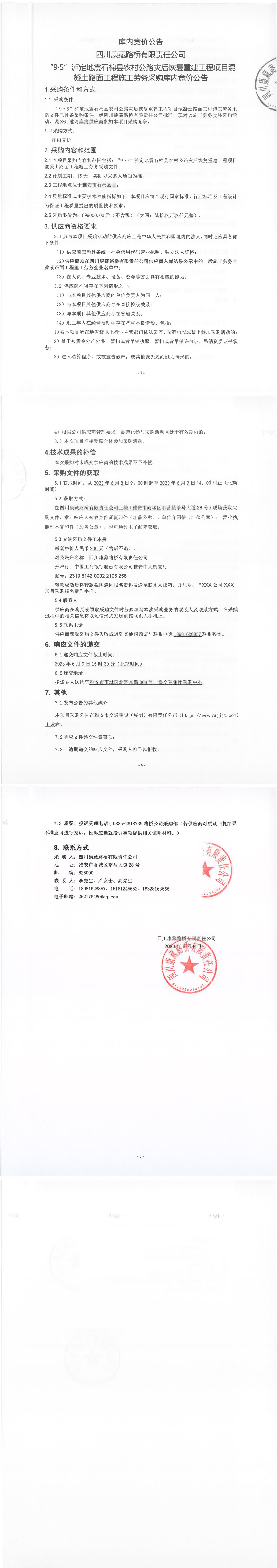 四川康藏路橋有限責(zé)任公司“9·5”瀘定地震石棉縣農(nóng)村公路災(zāi)后恢復(fù)重建工程項(xiàng)目混凝土路面工程施工勞務(wù)采購(gòu)庫(kù)內(nèi)競(jìng)價(jià)公告