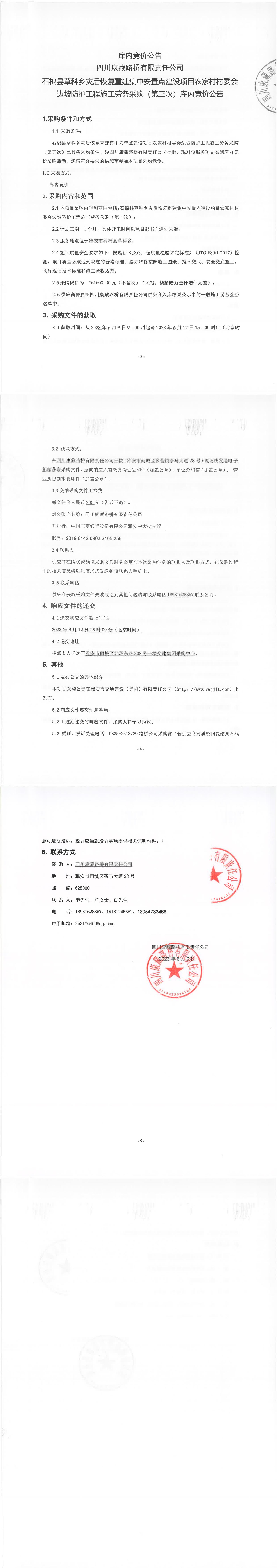 四川康藏路橋有限責(zé)任公司石棉縣草科鄉(xiāng)災(zāi)后恢復(fù)重建集中安置點(diǎn)建設(shè)項(xiàng)目農(nóng)家村村委會(huì)邊坡防護(hù)工程施工勞務(wù)采購(gòu)(第三次)庫(kù)內(nèi)競(jìng)價(jià)公告