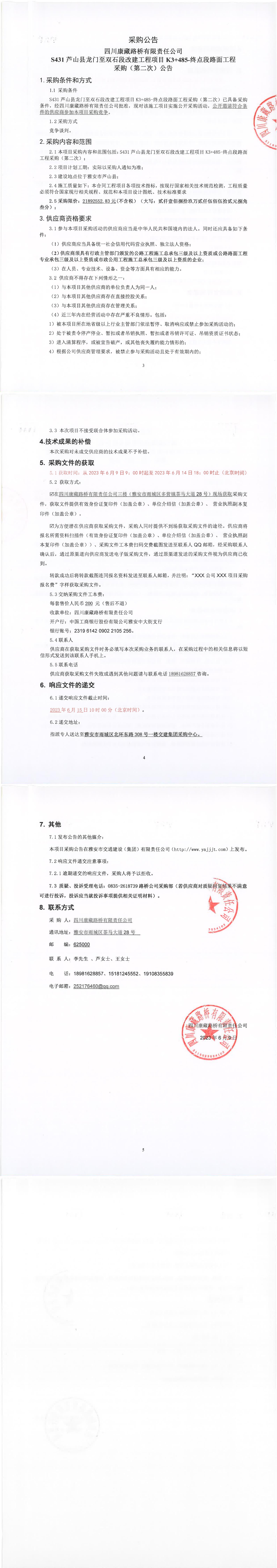 四川康藏路橋有限責(zé)任公司S431蘆山縣龍門至雙石段改建工程項(xiàng)目K3+485-終點(diǎn)段路面工程采購(gòu)(第二次)公告