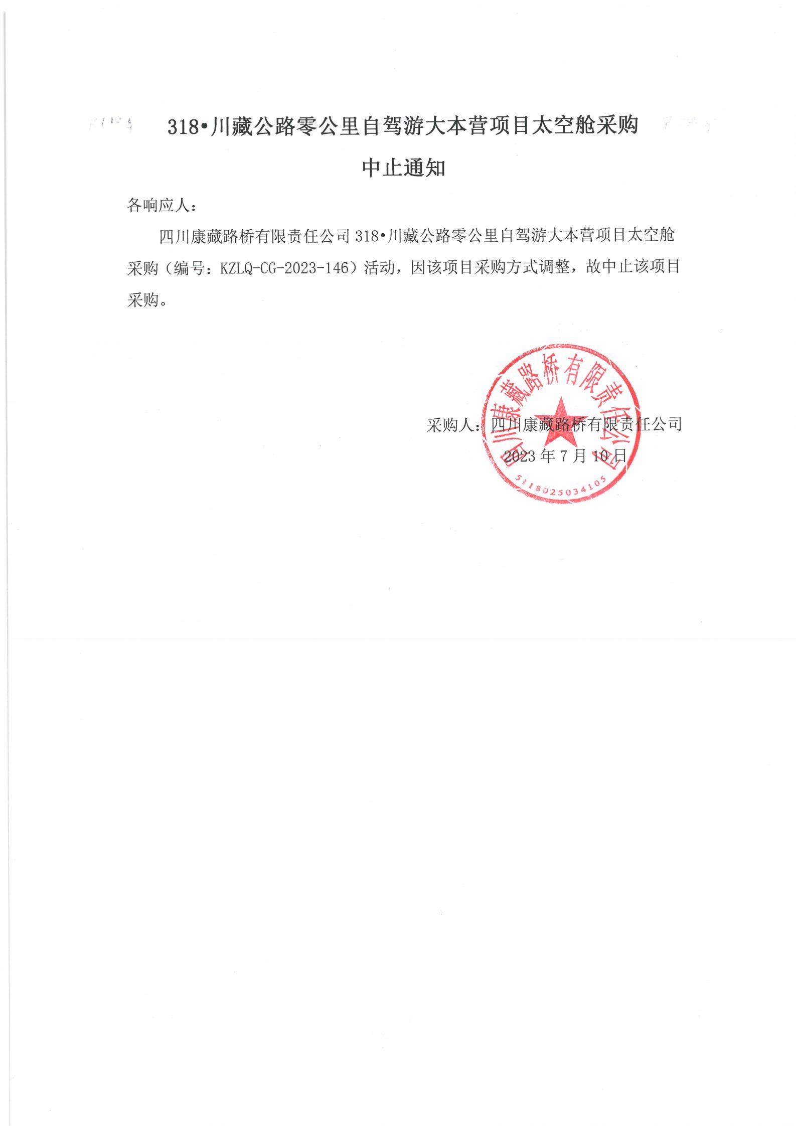 四川康藏路橋有限責(zé)任公司318·川藏公路零公里自駕游大本營(yíng)項(xiàng)目太空艙采購(gòu)中止通知