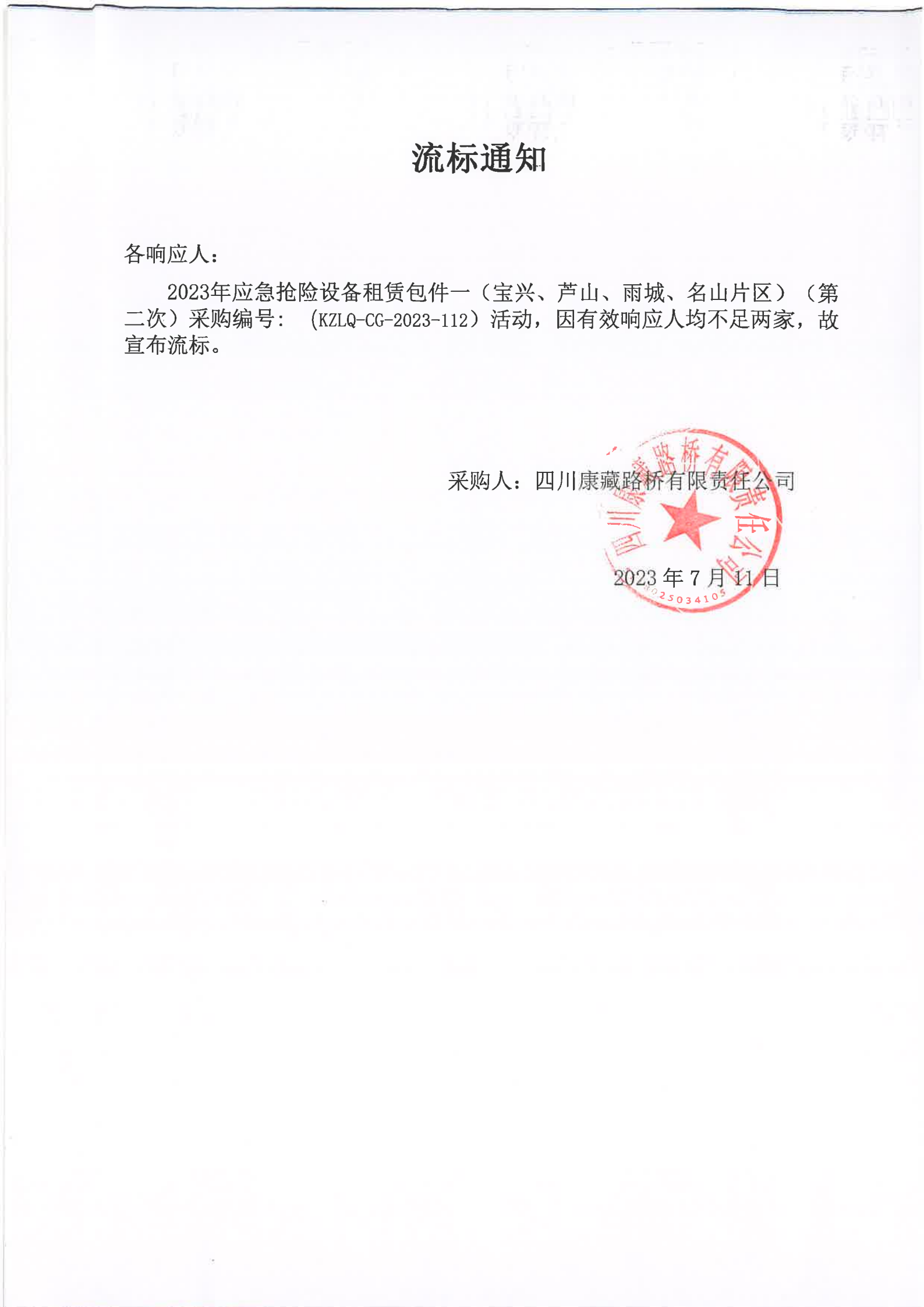 四川康藏路橋有限責(zé)任公司2023年應(yīng)急搶險設(shè)備租賃包件一(寶興、蘆山、雨城、名山片區(qū))(第二次)流標通知