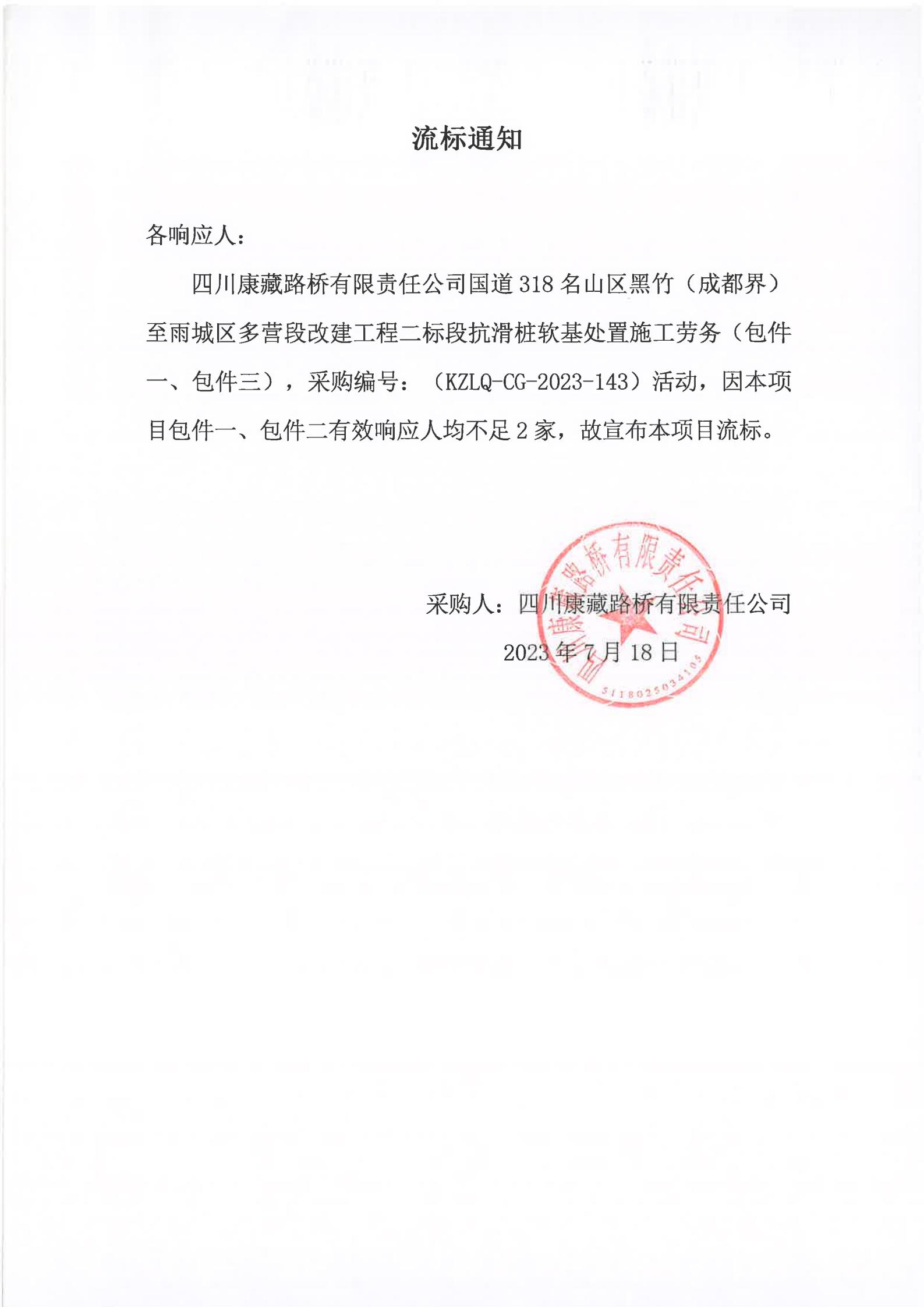 四川康藏路橋有限責(zé)任公司國(guó)道318名山區(qū)黑竹(成都界)至雨城區(qū)多營(yíng)段改建工程二標(biāo)段抗滑樁軟基處置施工勞務(wù)(包件一、包件三)流標(biāo)通知