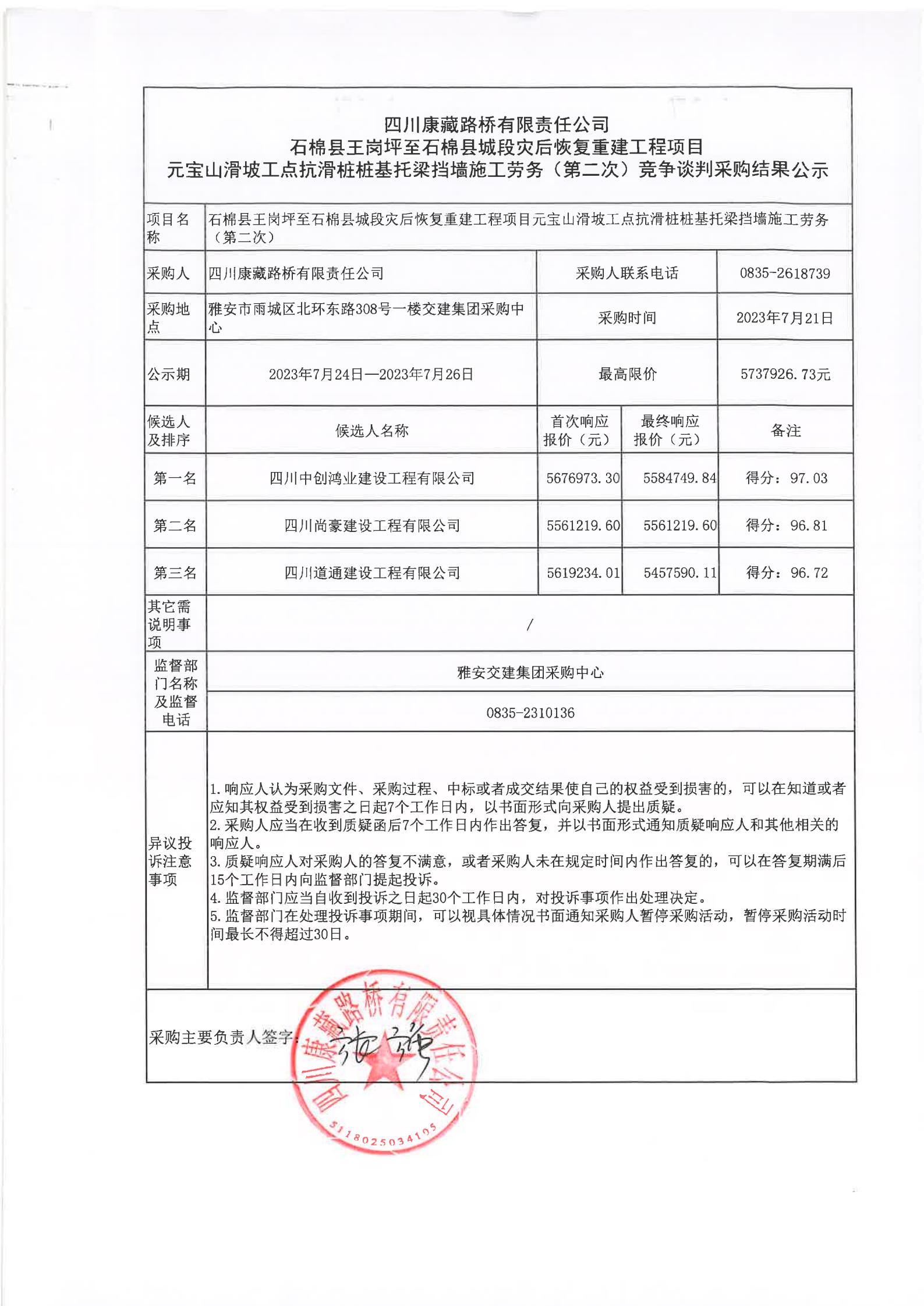 四川康藏路橋有限責任公司石棉縣王崗坪至石棉縣城段災(zāi)后恢復重建工程項目元寶山滑坡工點抗滑樁樁基托梁擋墻施工勞務(wù)(第二次)競爭談判采購結(jié)果公示