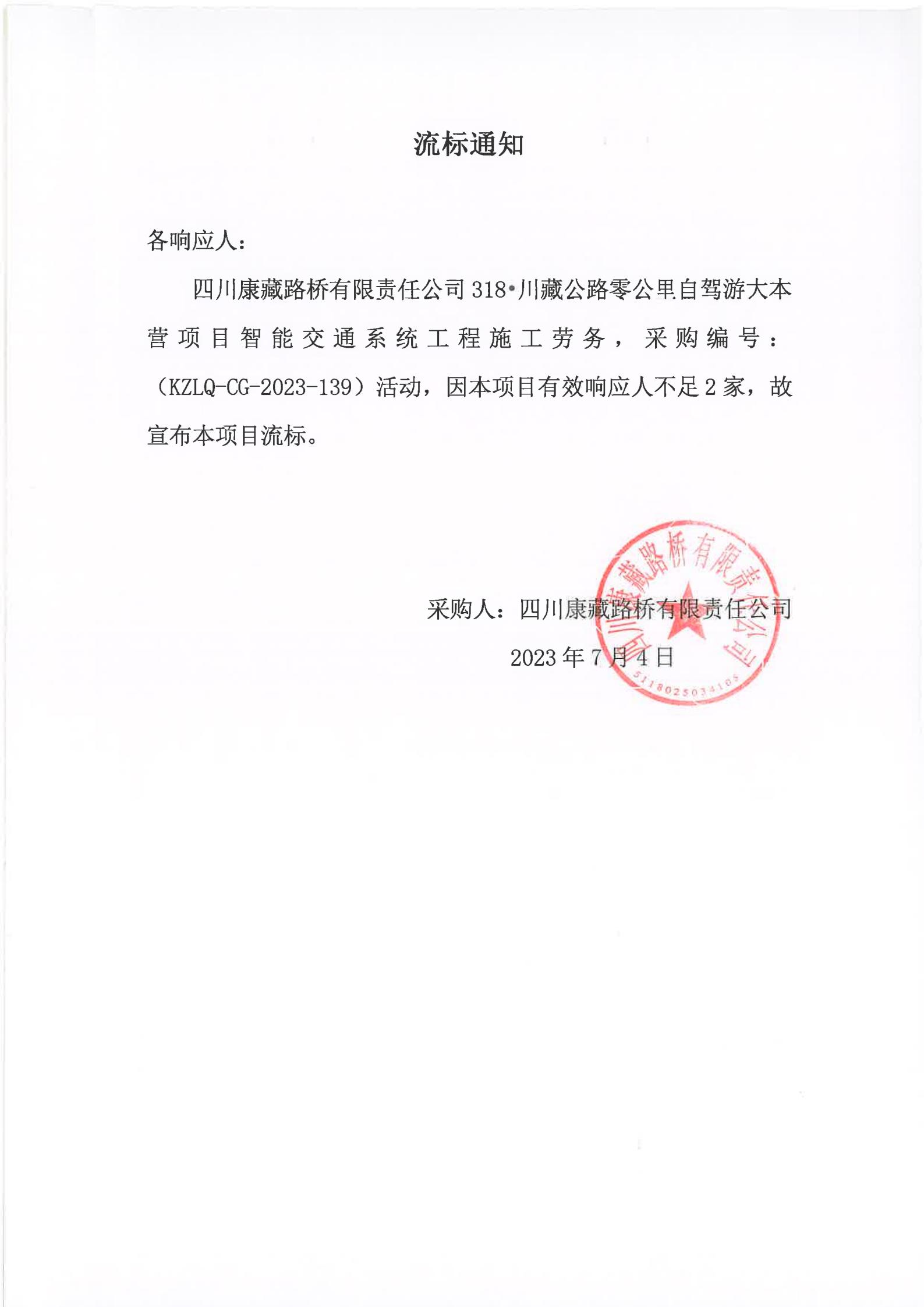 四川康藏路橋有限責任公司318·川藏公路零公里自駕游大本營項目智能交通系統(tǒng)工程施工勞務(wù)流標通知