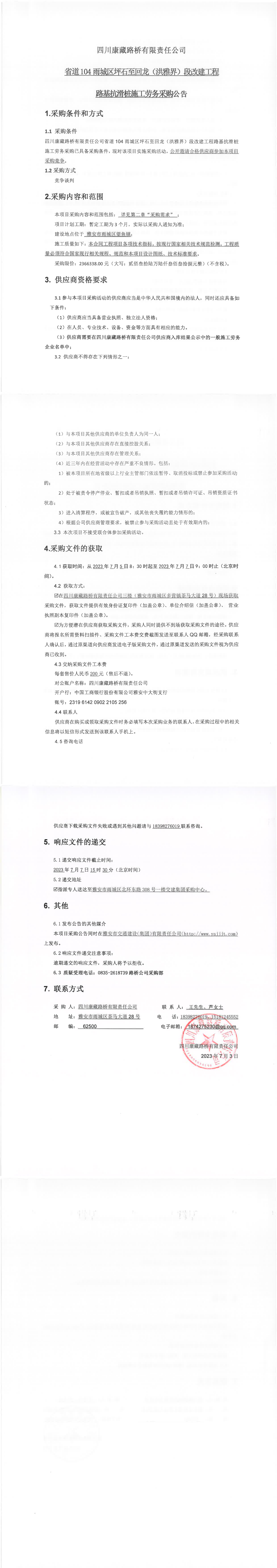 四川康藏路橋有限責任公司省道104雨城區(qū)坪石至回龍(洪雅界)段改建工程路基抗滑樁施工勞務采購公告