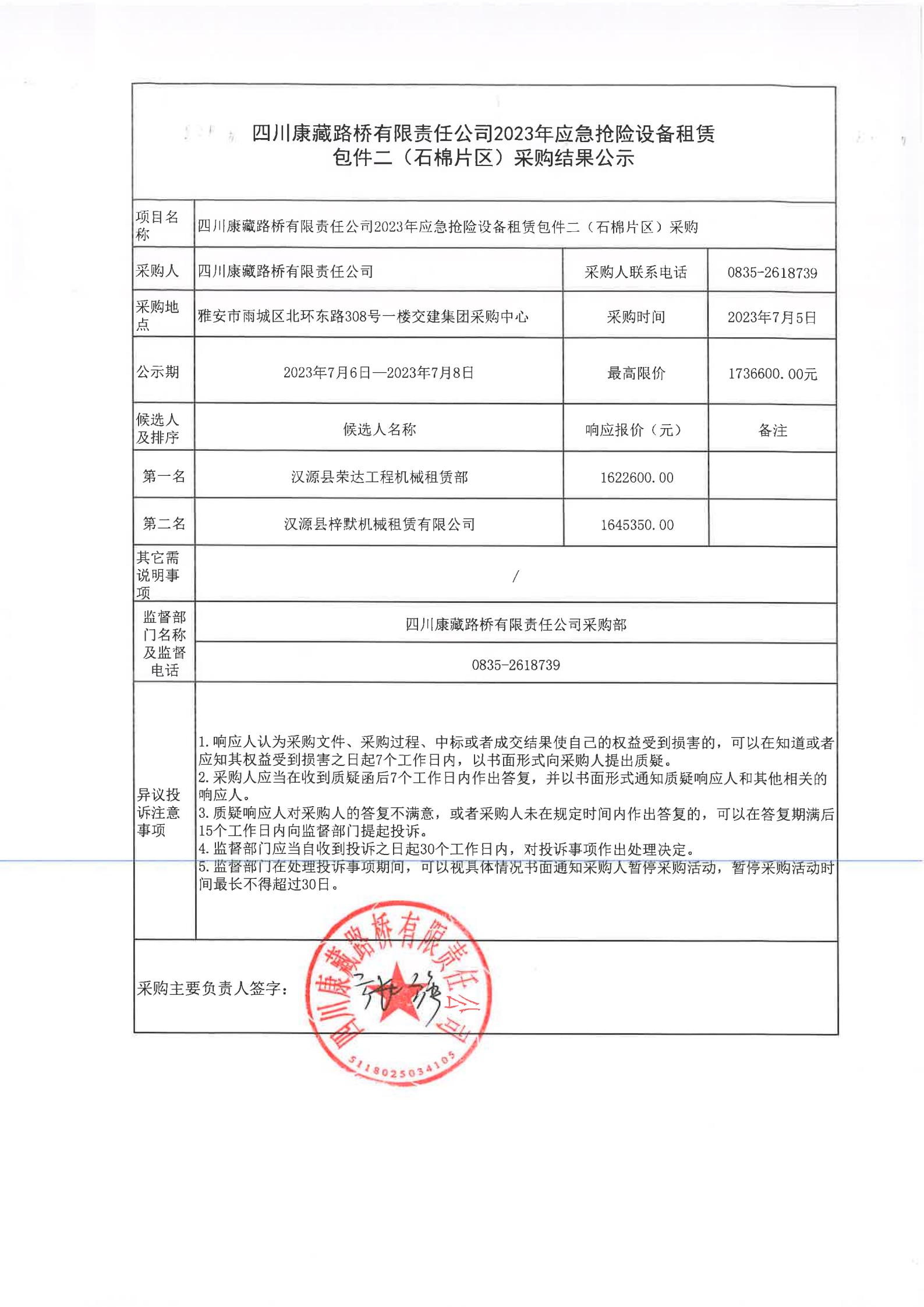 四川康藏路橋有限責(zé)任公司2023年應(yīng)急搶險設(shè)備租賃包件二(石棉片區(qū))采購結(jié)果公示
