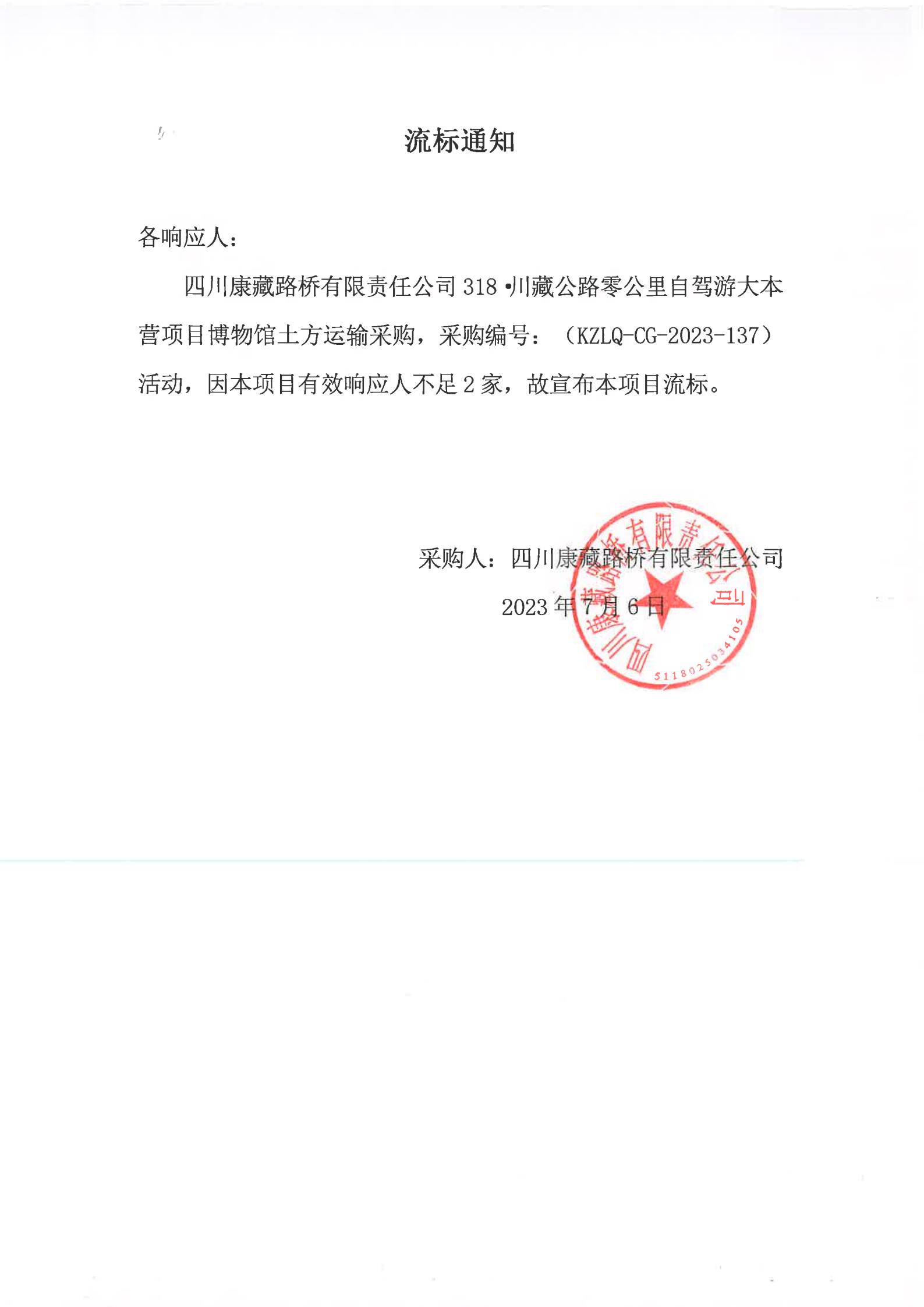 四川康藏路橋有限責(zé)任公司318·川藏公路零公里自駕游大本營(yíng)項(xiàng)目博物館土方運(yùn)輸采購(gòu)流標(biāo)通知