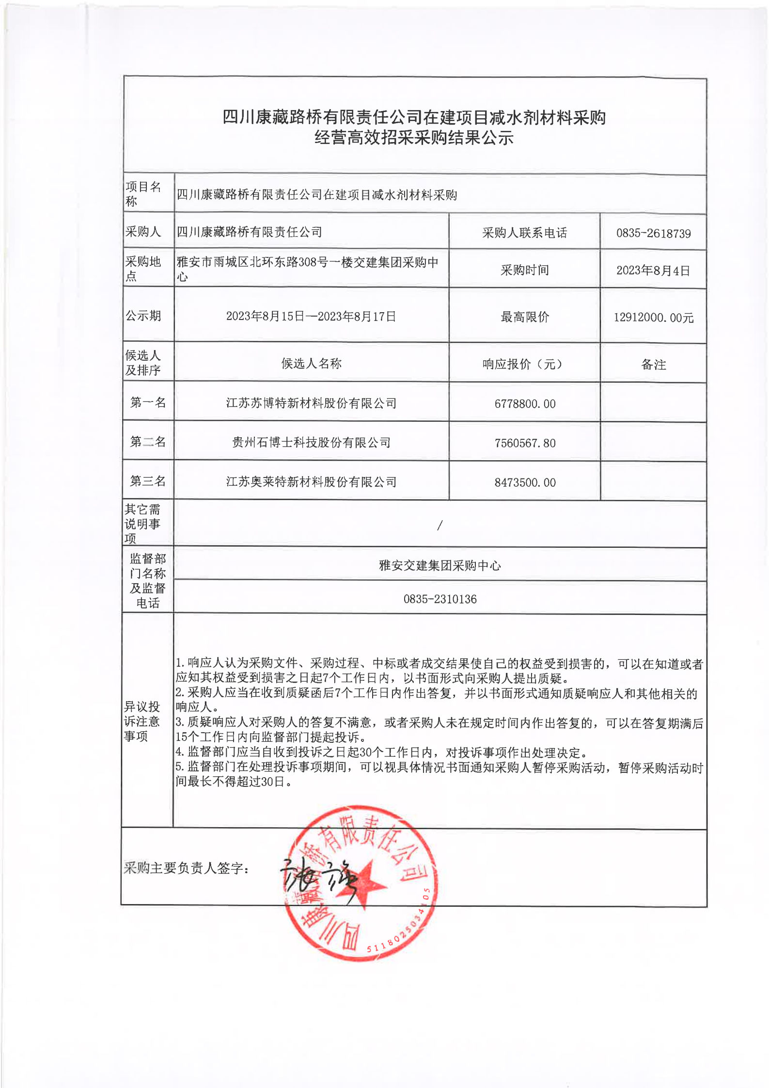 四川康藏路橋有限責任公司在建項目減水劑材料采購經營高效招采采購結果公示