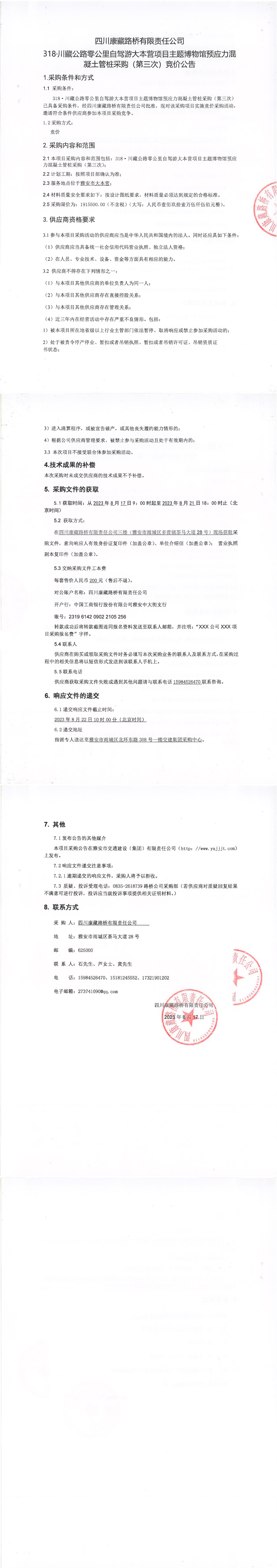 四川康藏路橋有限責(zé)任公司318·川藏公路零公里自駕游大本營(yíng)項(xiàng)目主題博物館預(yù)應(yīng)力混凝土管樁采購(gòu)(第三次)競(jìng)價(jià)公告