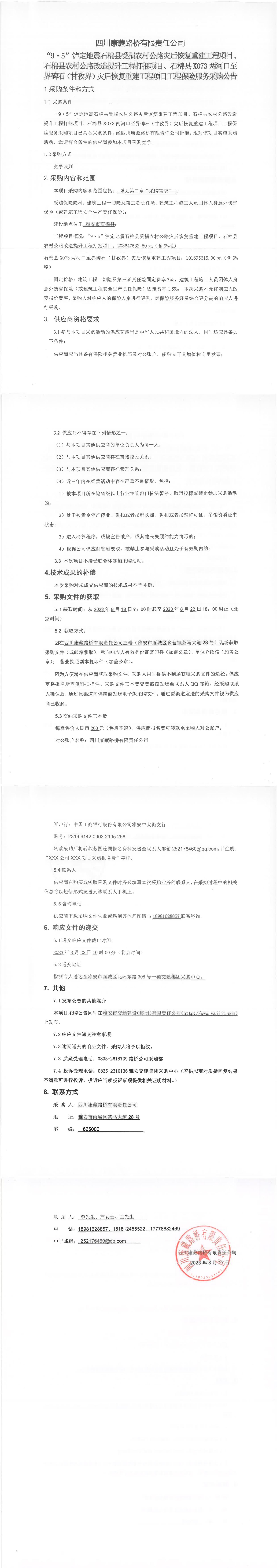 四川康藏路橋有限責任公司“9·5”瀘定地震石棉縣受損農(nóng)村公路災后恢復重建工程項目、石棉縣農(nóng)村公路改造提升工程打捆項目、石棉縣X073兩河口至界碑石(甘孜界)災后恢復重建工程項目工程保險服務(wù)采購公告