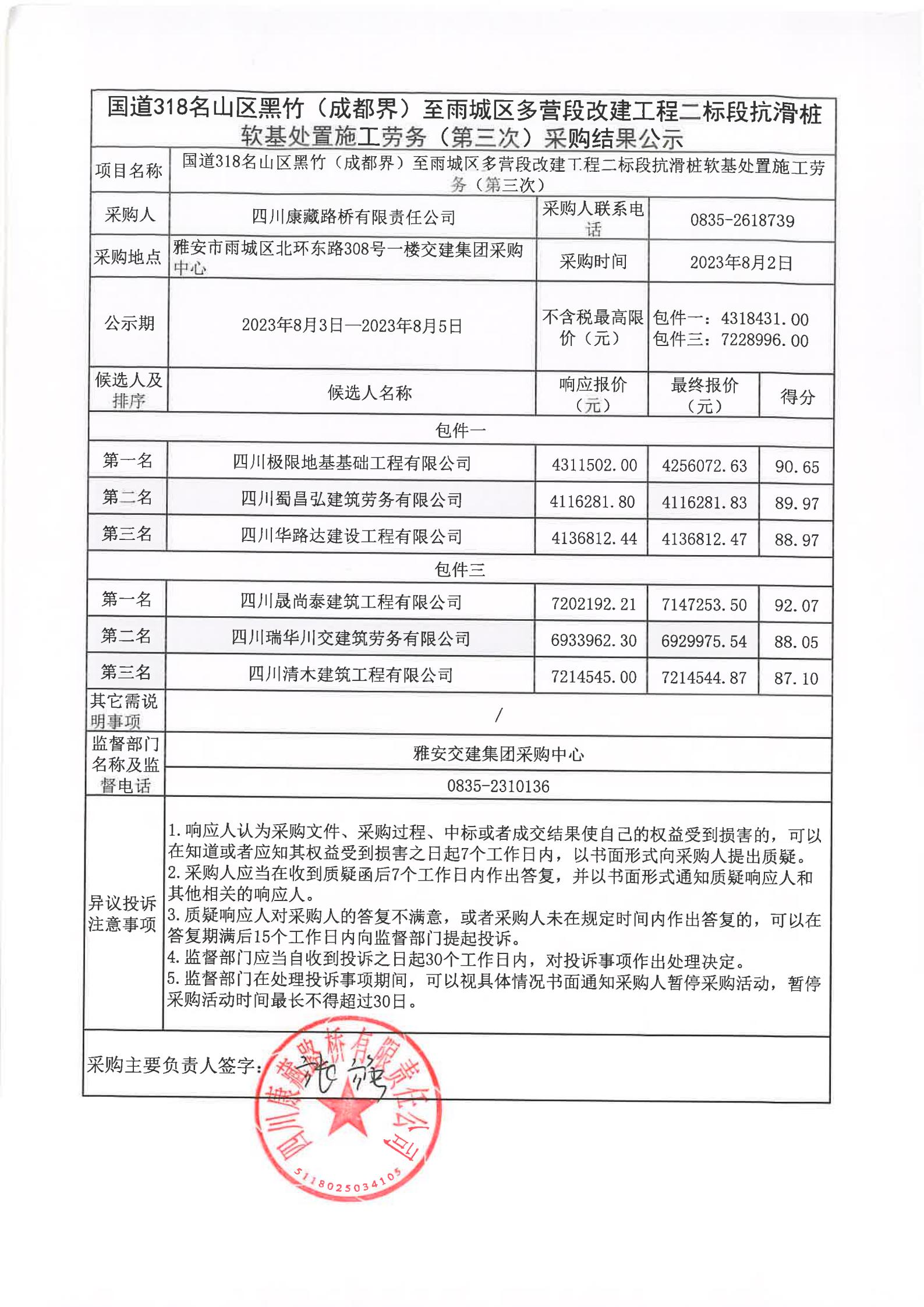 四川康藏路橋有限責(zé)任公司國道318名山區(qū)黑竹(成都界)至雨城區(qū)多營段改建工程二標(biāo)段抗滑樁軟基處置施工勞務(wù)(第三次)采購結(jié)果公示