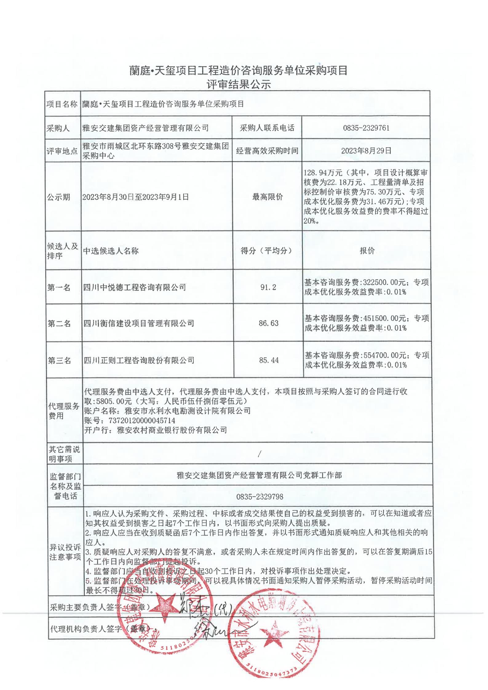 雅安交建集團(tuán)資產(chǎn)經(jīng)營(yíng)管理有限公司蘭庭·天璽項(xiàng)目工程造價(jià)咨詢服務(wù)單位采購(gòu)項(xiàng)目評(píng)審結(jié)果公示
