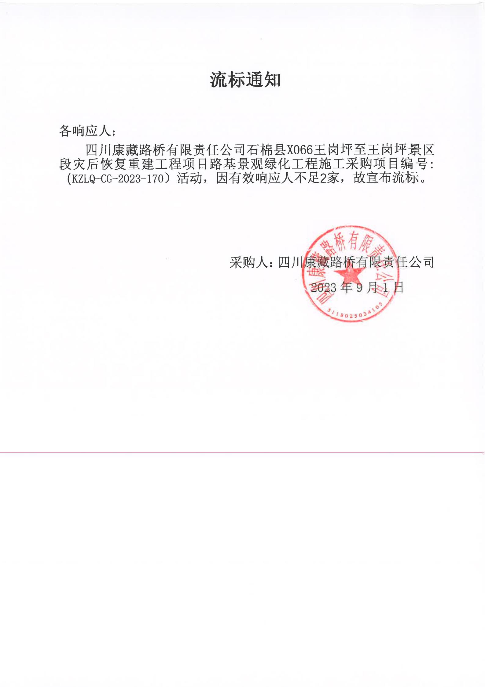 四川康藏路橋有限責任公司石棉縣X066王崗坪至王崗坪景區(qū)段災后恢復重建工程項目路基景觀綠化工程施工采購流標通知