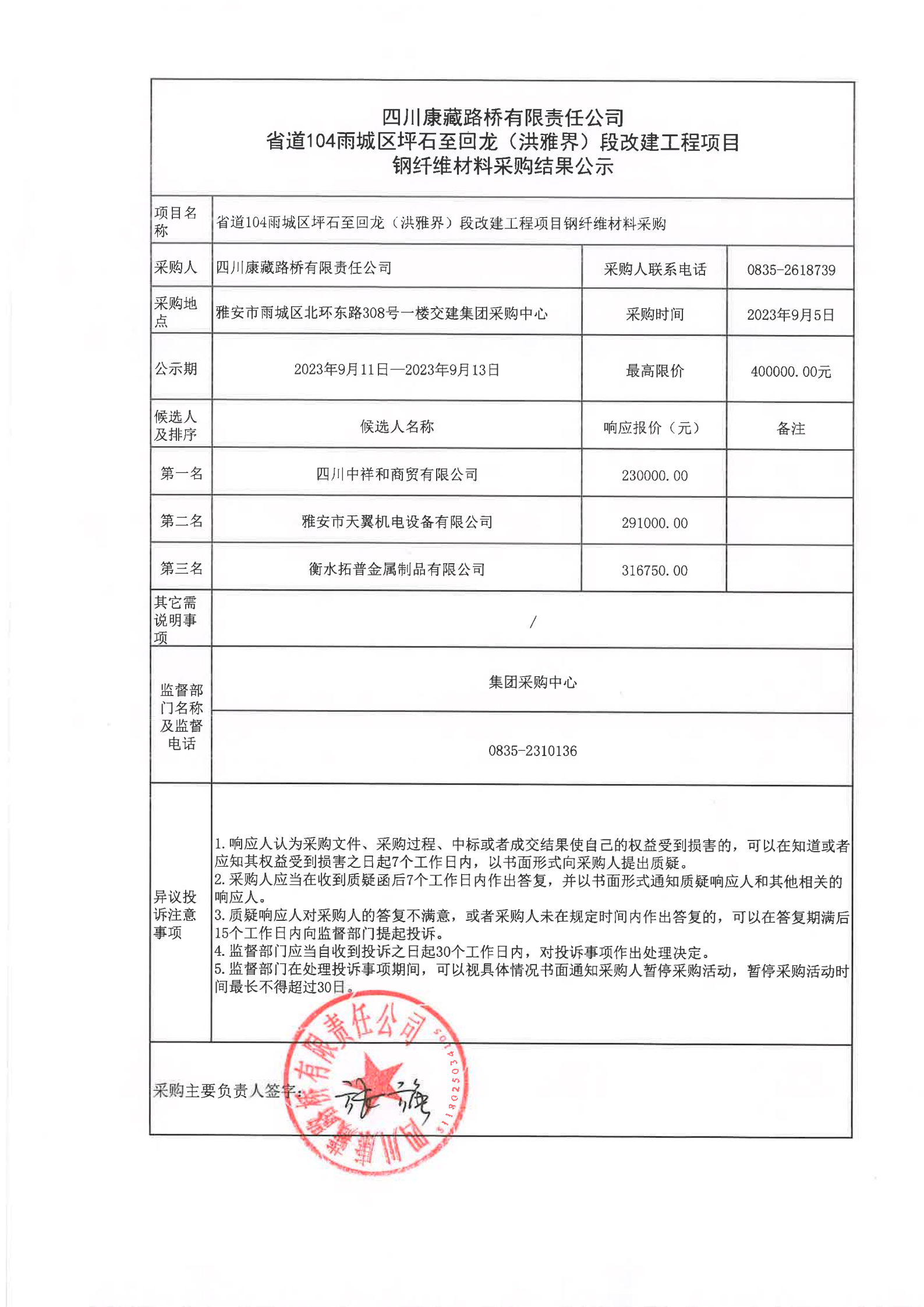 四川康藏路橋有限責任公司省道104雨城區(qū)坪石至回龍(洪雅界)段改建工程項目鋼纖維材料采購結果公示