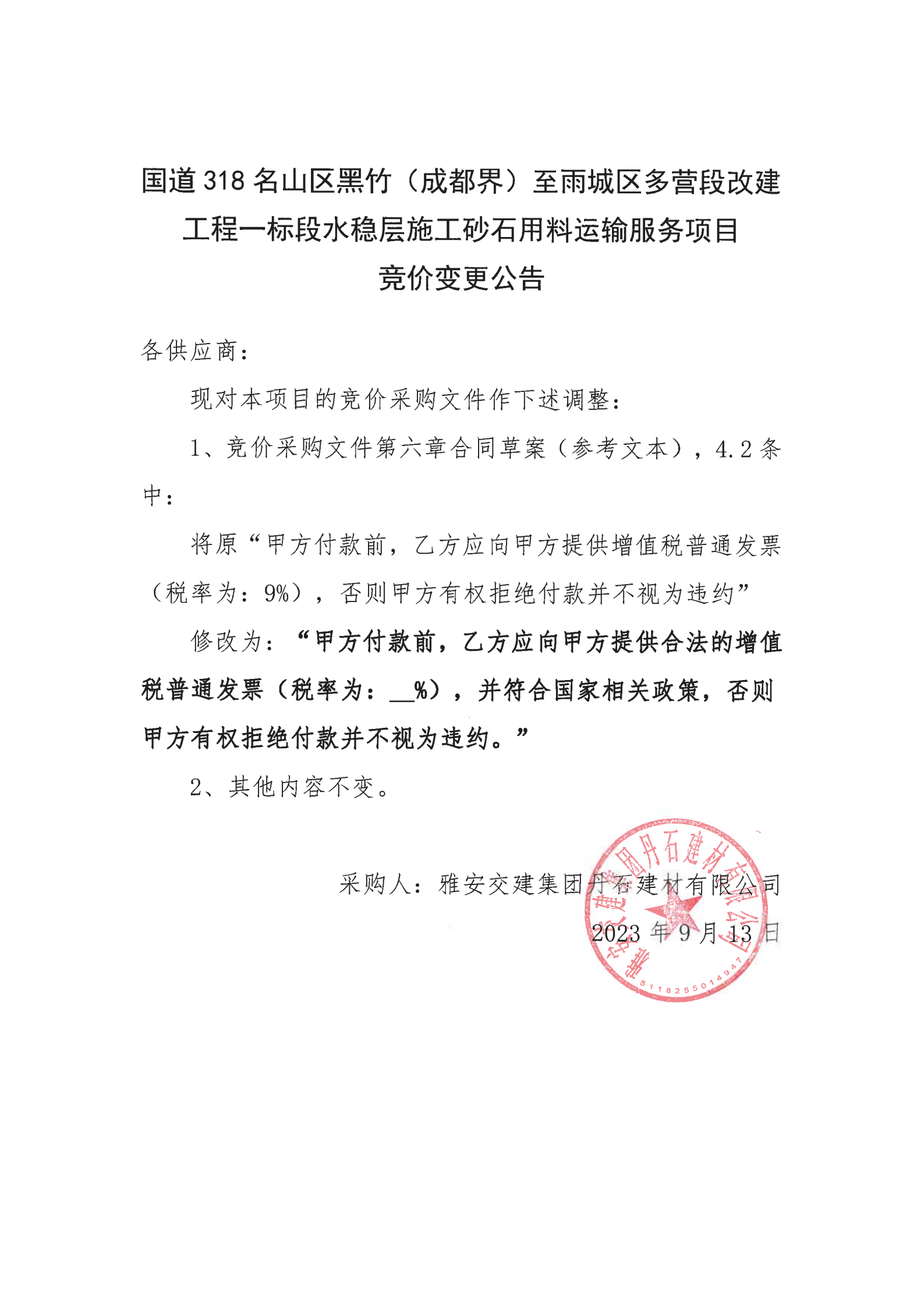 雅安交建集團丹石建材有限公司國道318名山區(qū)黑竹(成都界)至雨城區(qū)多營段改建工程一標段水穩(wěn)層施工砂石用料運輸服務項目競價變更公告