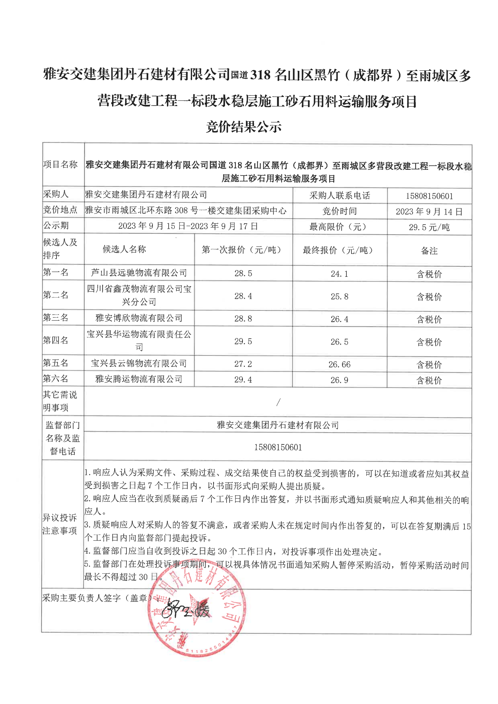 雅安交建集團(tuán)丹石建材有限公司國道318名山區(qū)黑竹(成都界)至雨城區(qū)多營段改建工程一標(biāo)段水穩(wěn)層施工砂石用料運輸服務(wù)項目競價結(jié)果公示