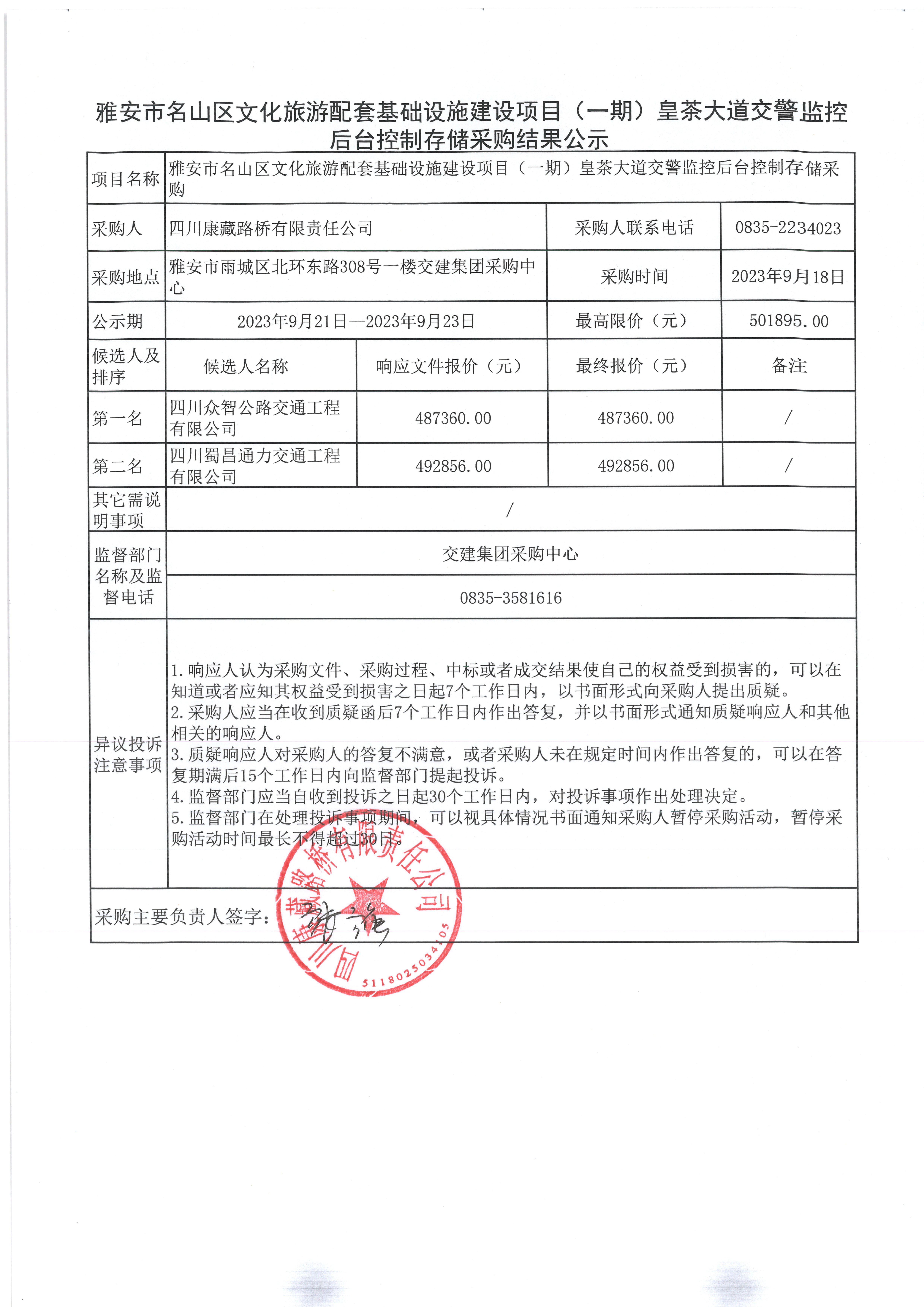 四川康藏路橋有限責(zé)任公司雅安市名山區(qū)文化旅游配套基礎(chǔ)設(shè)施建設(shè)項目(一期)皇茶大道交警監(jiān)控后臺控制存儲采購結(jié)果公示