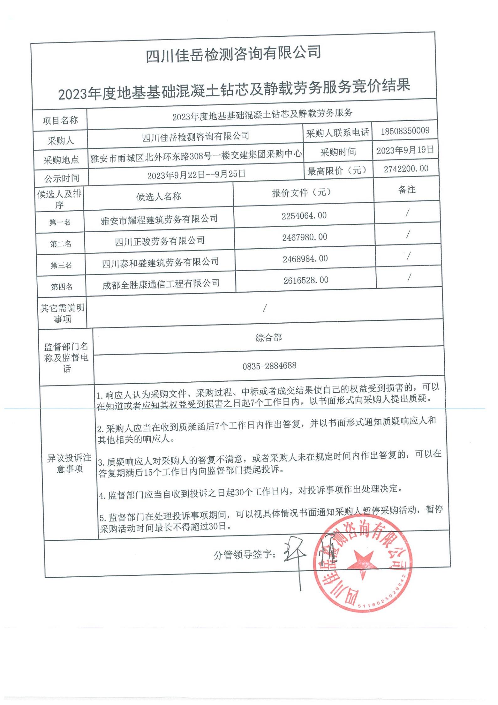 四川佳岳檢測(cè)咨詢有限公司2023年度地基基礎(chǔ)混凝土鉆芯及靜載勞務(wù)庫內(nèi)競價(jià)結(jié)果