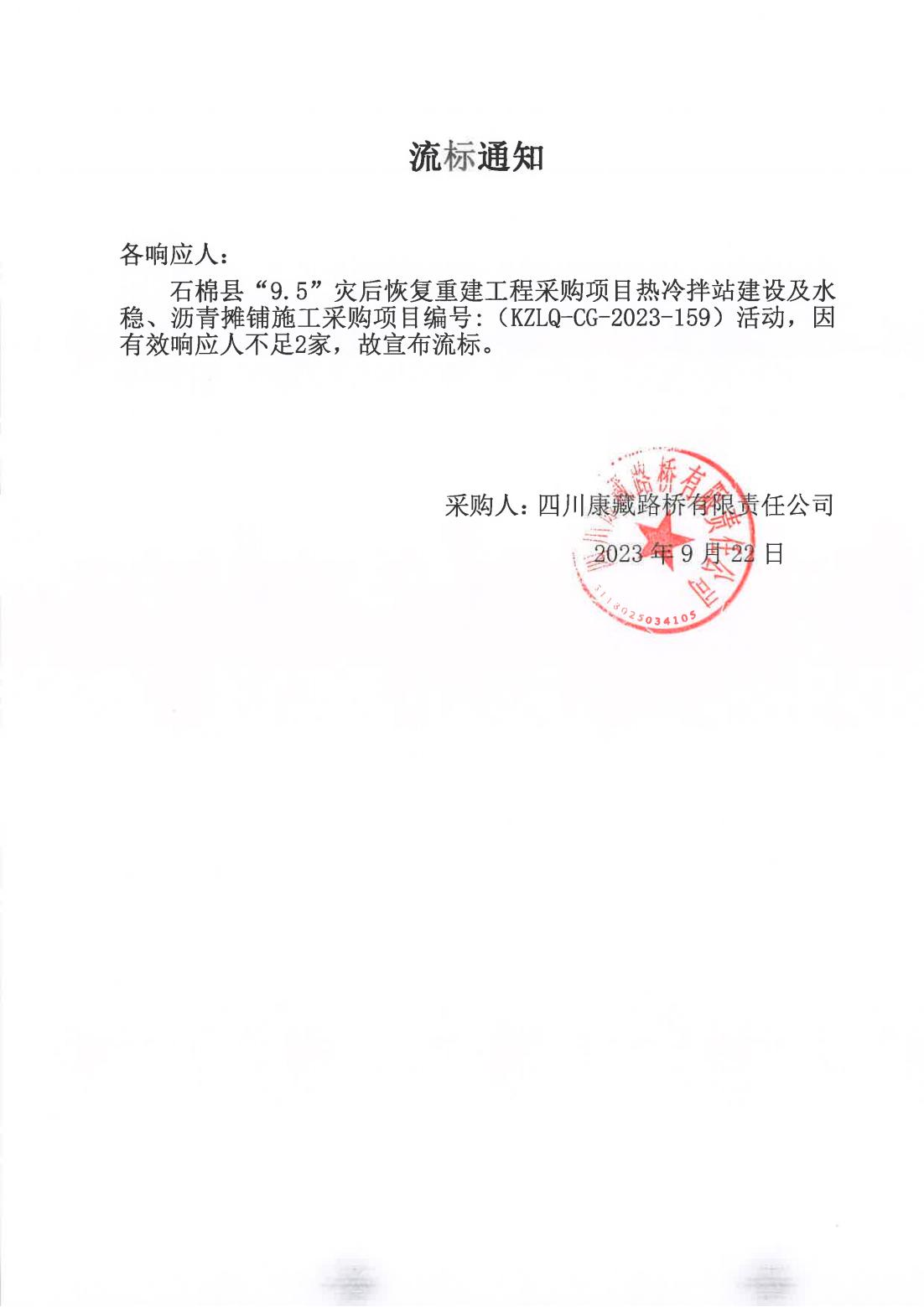 四川康藏路橋有限責任公司石棉縣“9·5”災后恢復重建工程采購項目熱冷拌站建設(shè)及水穩(wěn)、瀝青攤鋪施工采購流標通知