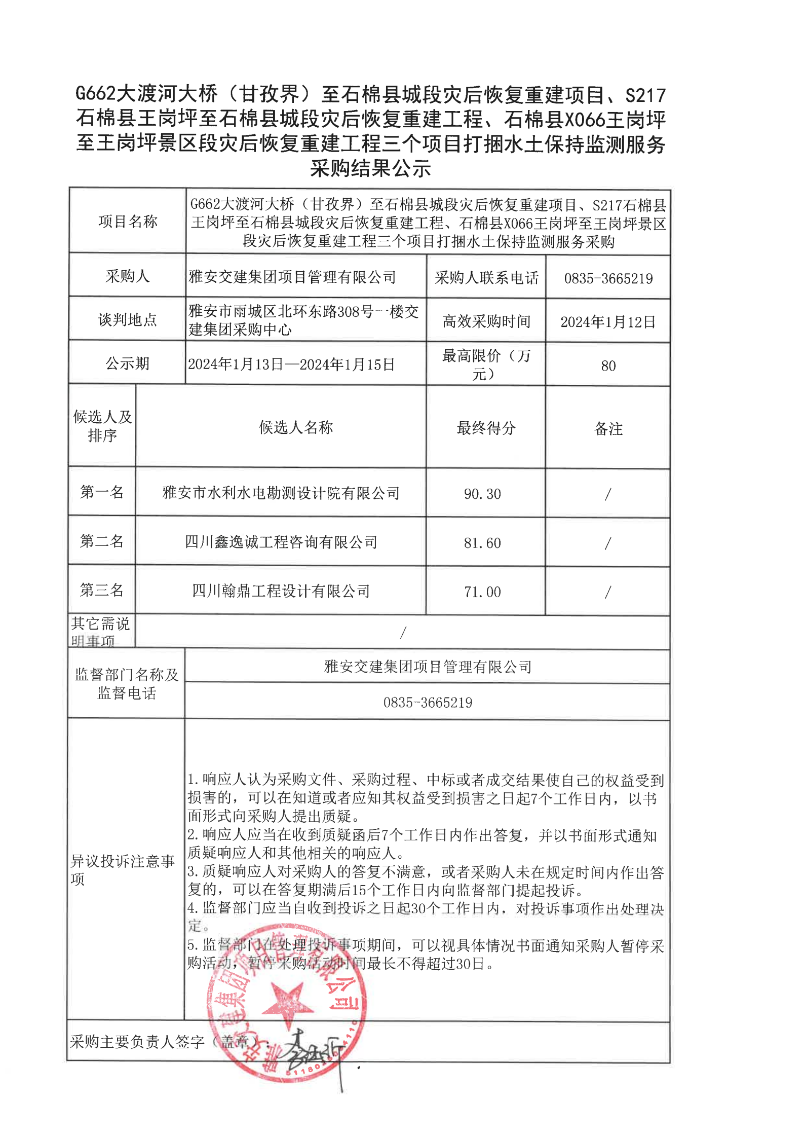 雅安交建集團項目管理有限公司G662大渡河大橋(甘孜界)至石棉縣城段災后恢復重建項目、S217石棉縣王崗坪至石棉縣城段災后恢復重建工程、石棉縣X066王崗坪至王崗坪景區(qū)段災后恢復重建工程三個項目打捆水土保持監(jiān)測服務采購結(jié)果公示