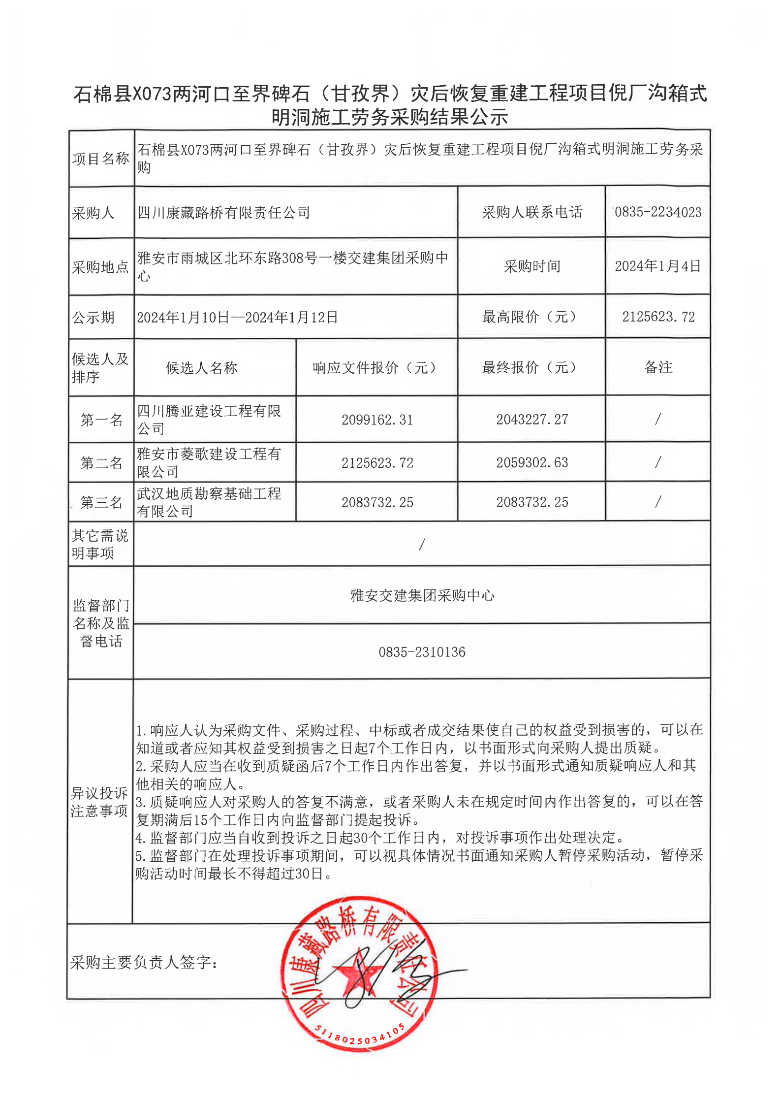四川康藏路橋有限責任公司石棉縣X073兩河口至界碑石(甘孜界)災后恢復重建工程項目倪廠溝箱式明洞施工勞務采購結果公示