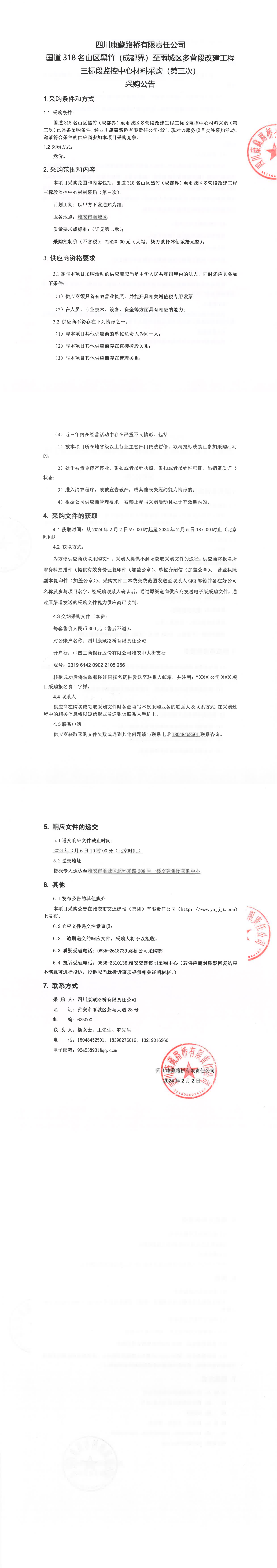 四川康藏路橋有限責(zé)任公司國(guó)道318名山區(qū)黑竹(成都界)至雨城區(qū)多營(yíng)段改建工程三標(biāo)段監(jiān)控中心材料采購(gòu)(第三次)采購(gòu)公告