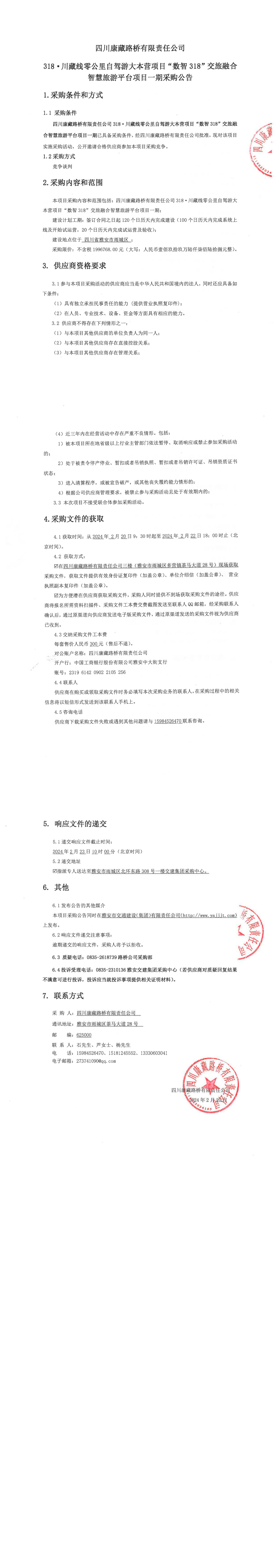 四川康藏路橋有限責任公司318·川藏線零公里自駕游大本營項目“數(shù)智318”交旅融合智慧旅游平臺項目一期采購公告