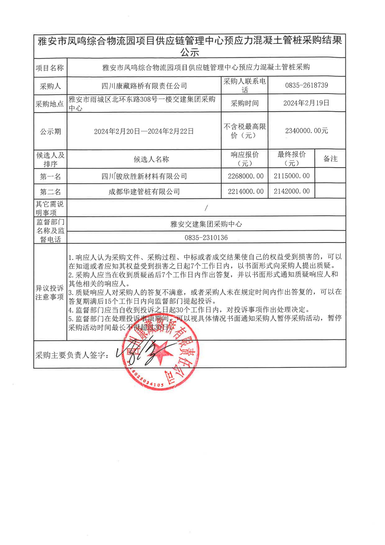 四川康藏路橋有限責任公司雅安市鳳鳴綜合物流園項目供應鏈管理中心預應力混凝土管樁采購結果公示