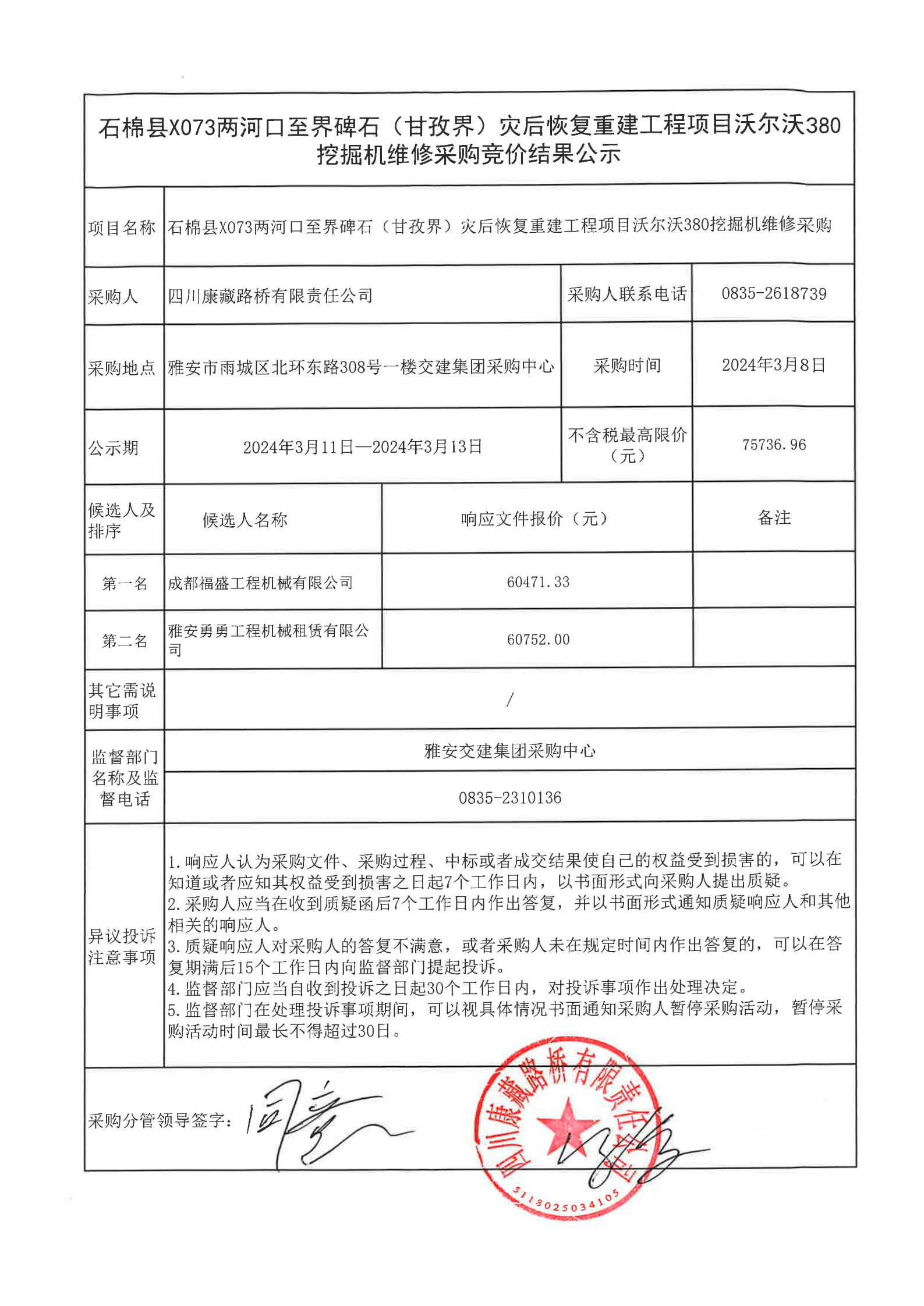 四川康藏路橋有限責任公司石棉縣X073兩河口至界碑石(甘孜界)災(zāi)后恢復(fù)重建工程項目沃爾沃380挖掘機維修采購競價結(jié)果公示