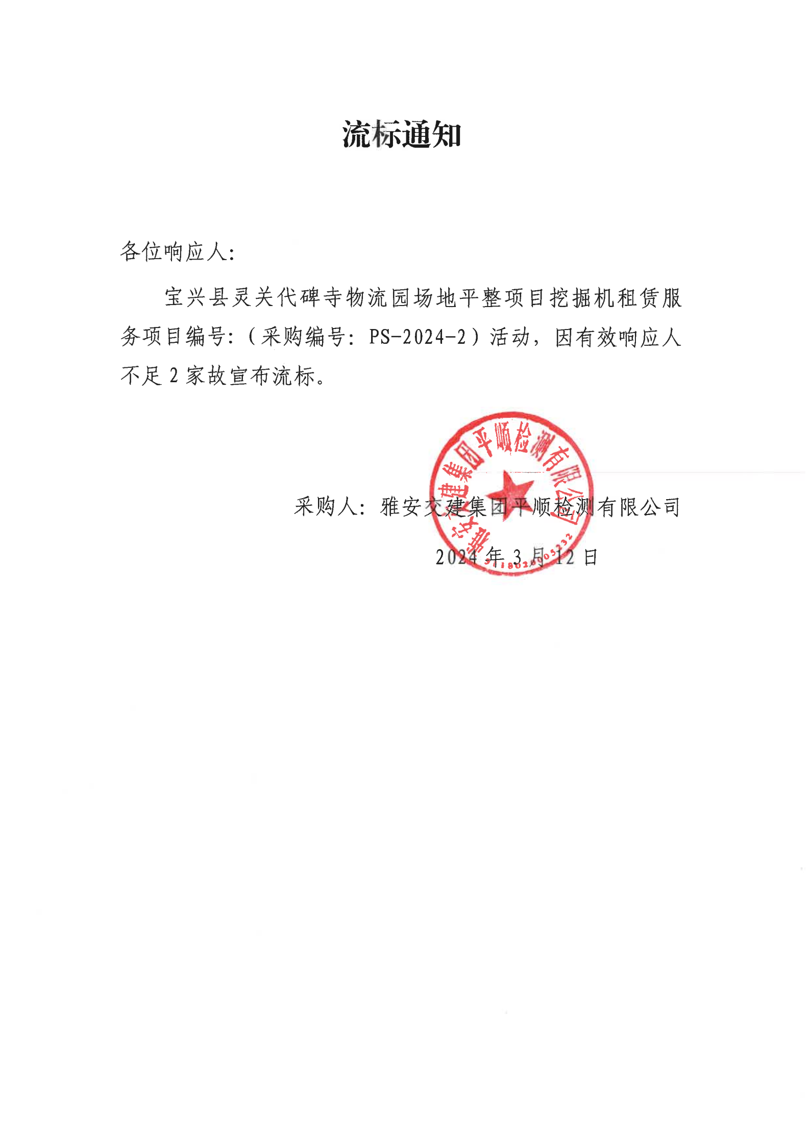 雅安交建集團(tuán)平順檢測有限公司寶興縣靈關(guān)代碑寺物流園場地平整項(xiàng)目挖掘機(jī)租賃服務(wù)流標(biāo)通知