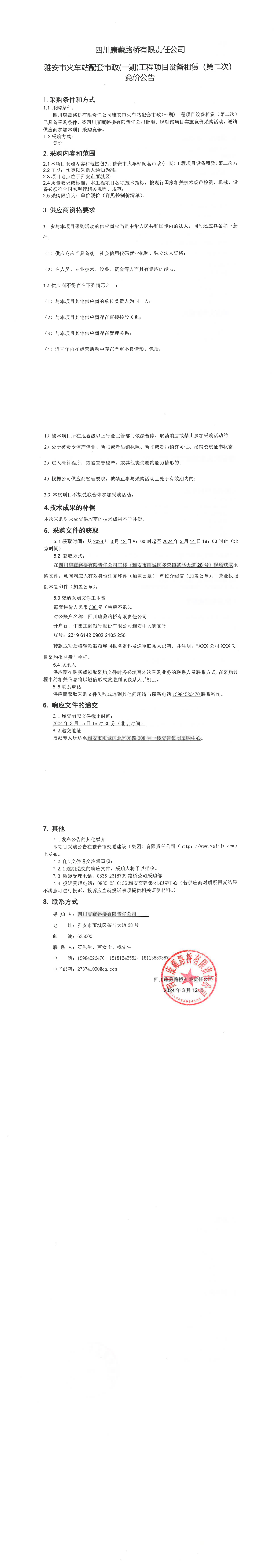四川康藏路橋有限責(zé)任公司雅安市火車站配套市政(一期)工程項(xiàng)目設(shè)備租賃(第二次)競(jìng)價(jià)公告