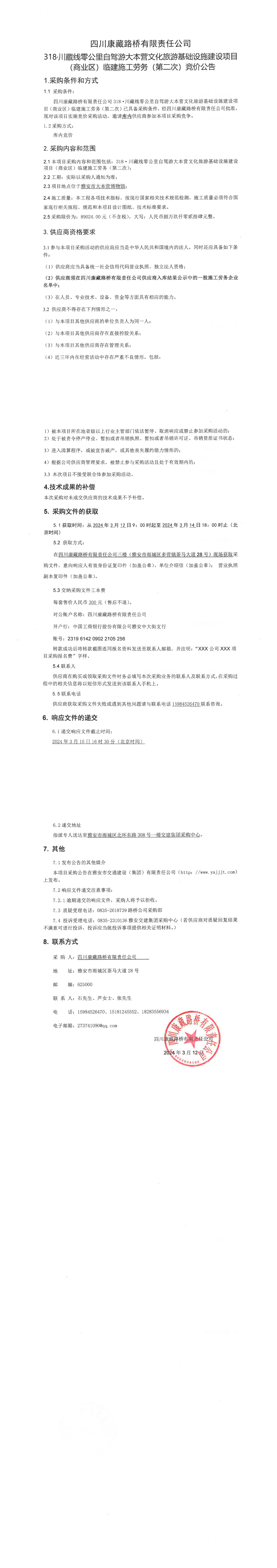 四川康藏路橋有限責(zé)任公司318·川藏公路零公里自駕游大本營(yíng)文化旅游基礎(chǔ)設(shè)施建設(shè)項(xiàng)目(商業(yè)區(qū))臨建施工勞務(wù)(第二次)競(jìng)價(jià)公告