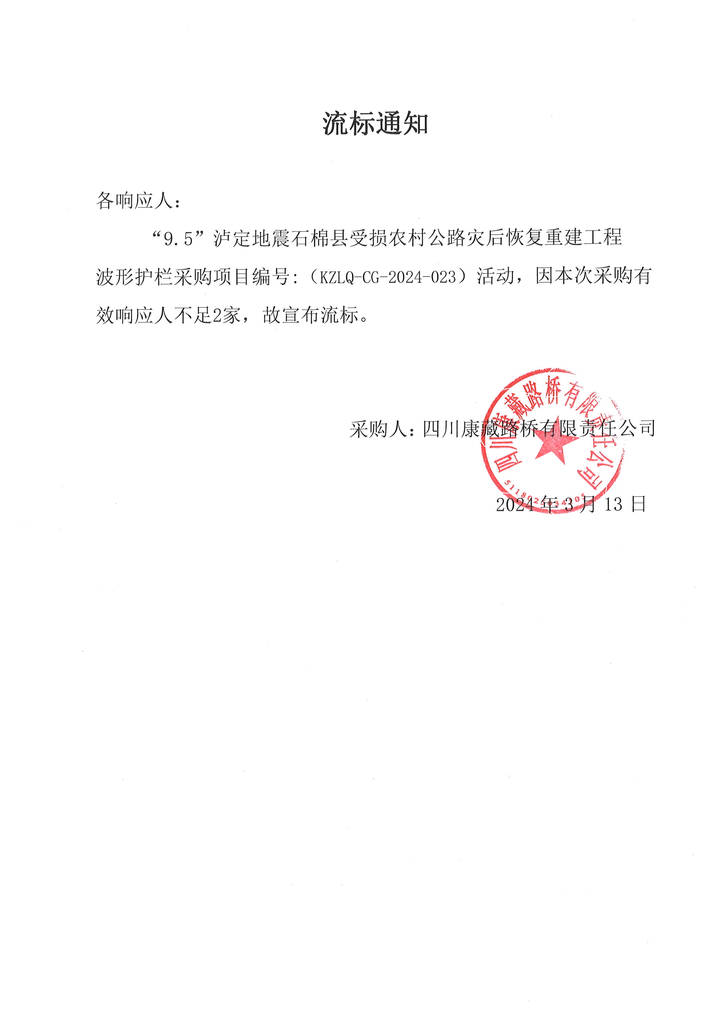 四川康藏路橋有限責任公司“9.5”瀘定地震石棉縣受損農村公路災后恢復重建工程波形護欄采購流標通知