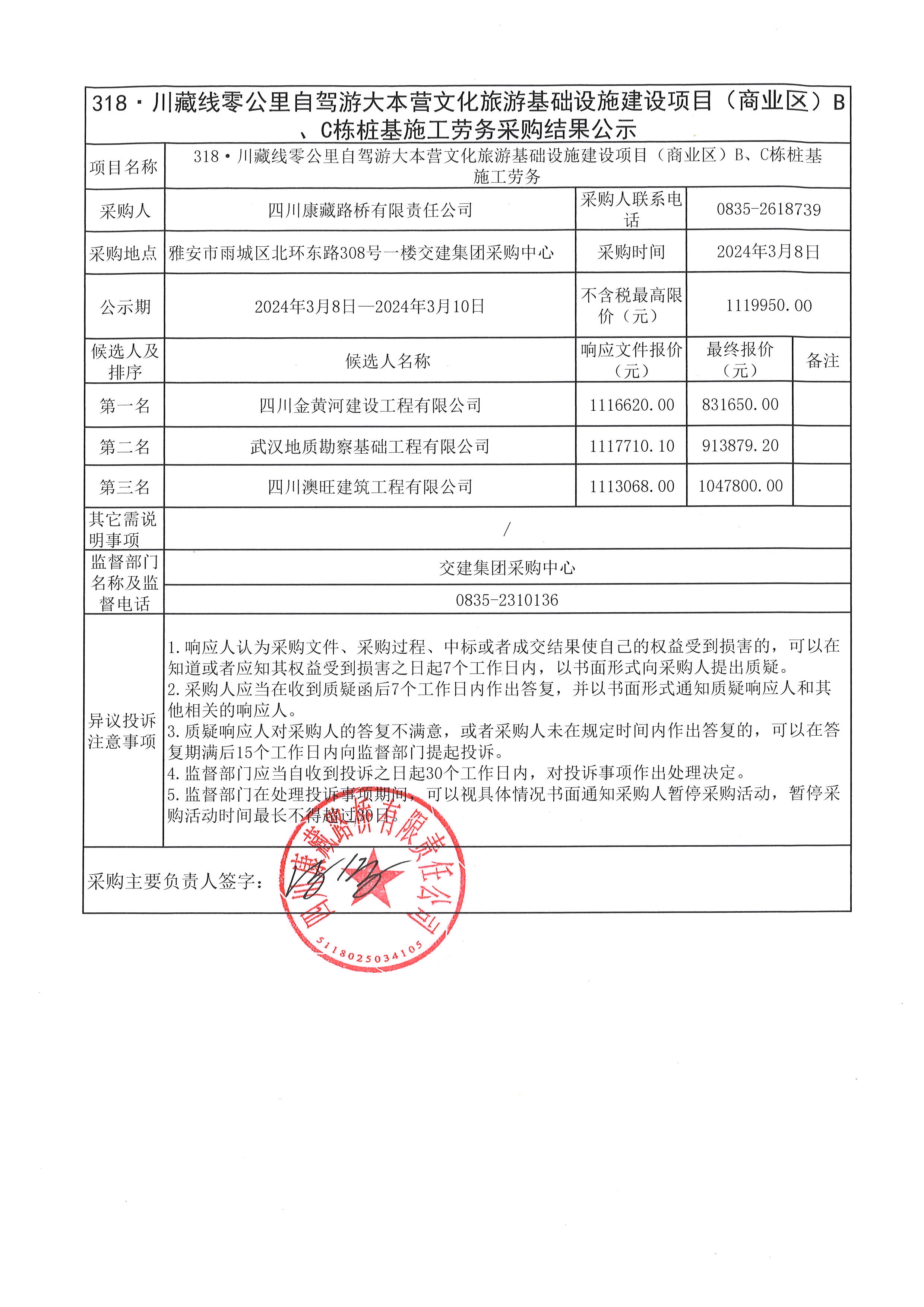 四川康藏路橋有限責(zé)任公司318·川藏線零公里自駕游大本營文化旅游基礎(chǔ)設(shè)施建設(shè)項目(商業(yè)區(qū))B、C棟樁基施工勞務(wù)結(jié)果公示