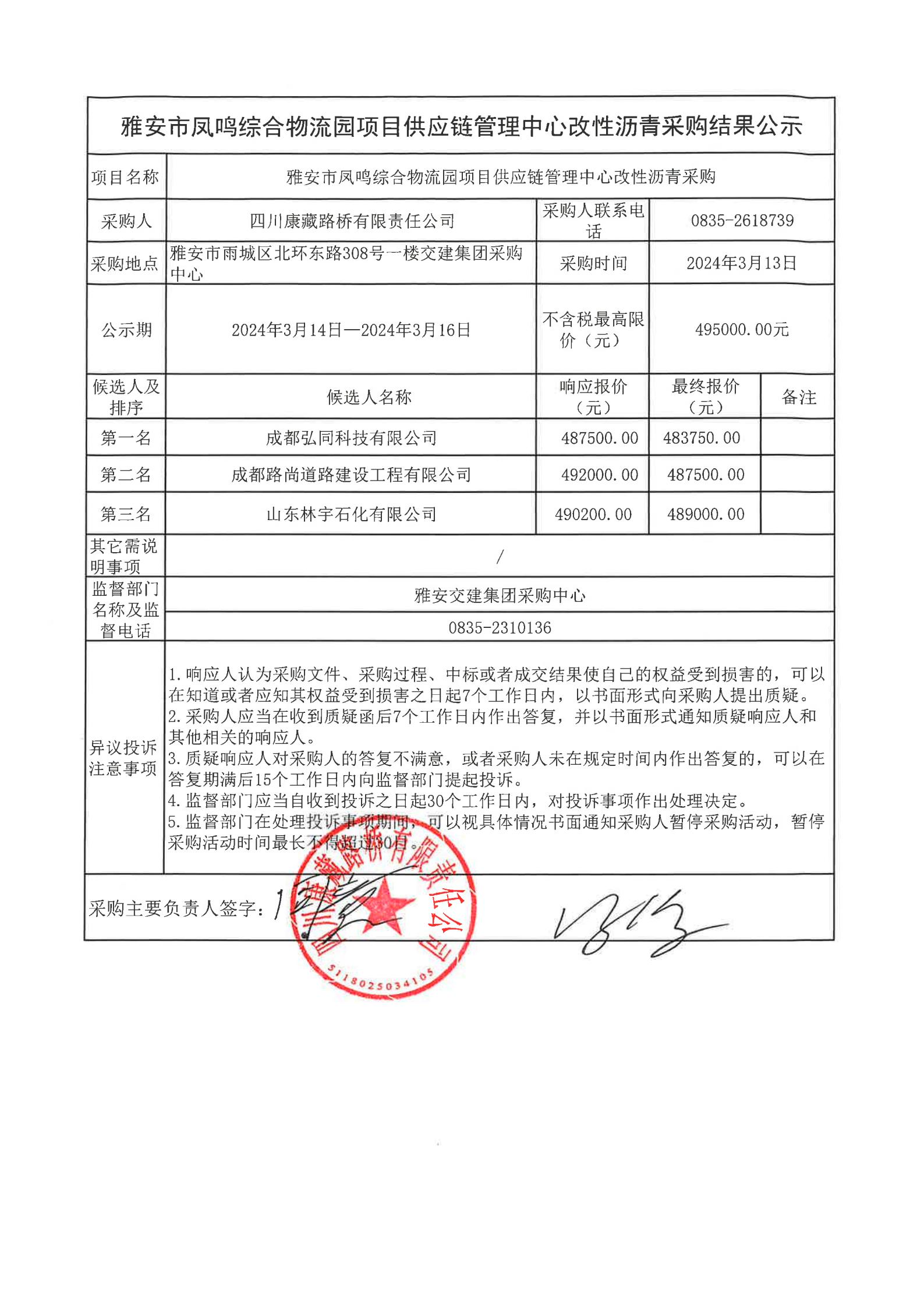 四川康藏路橋有限責(zé)任公司雅安市鳳鳴綜合物流園項(xiàng)目供應(yīng)鏈管理中心改性瀝青采購(gòu)結(jié)果公示