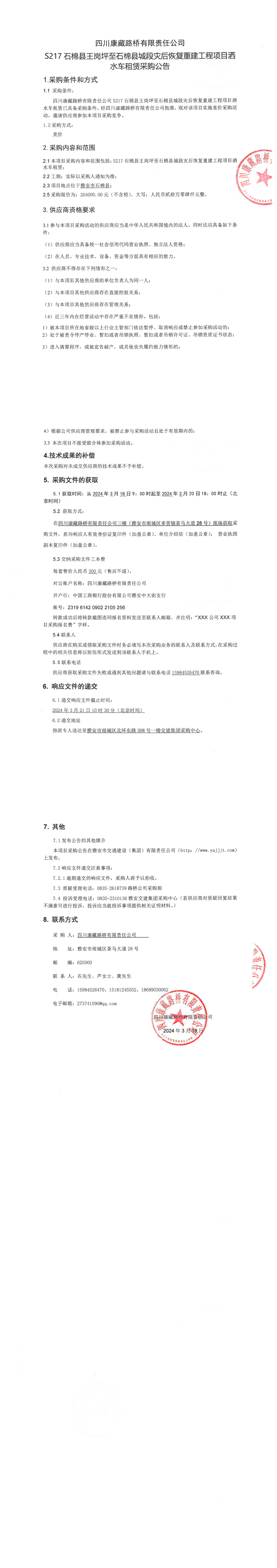 四川康藏路橋有限責(zé)任公司S217石棉縣王崗坪至石棉縣城段災(zāi)后恢復(fù)重建工程項目灑水車租賃采購公告