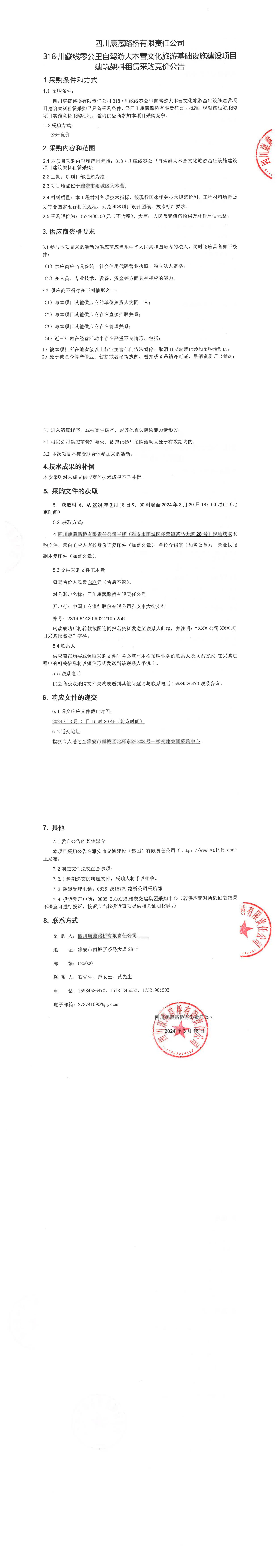 四川康藏路橋有限責任公司318·川藏線零公里自駕游大本營文化旅游基礎設施建設項目建筑架料采購公告