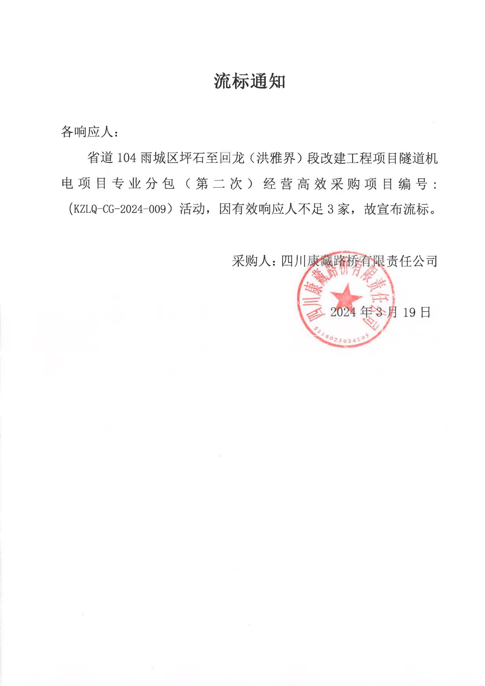 四川康藏路橋有限責(zé)任公司省道104雨城區(qū)坪石至回龍(洪雅界)段改建工程項(xiàng)目隧道機(jī)電項(xiàng)目專業(yè)分包經(jīng)營(yíng)高效采購(gòu)(第二次)流標(biāo)通知