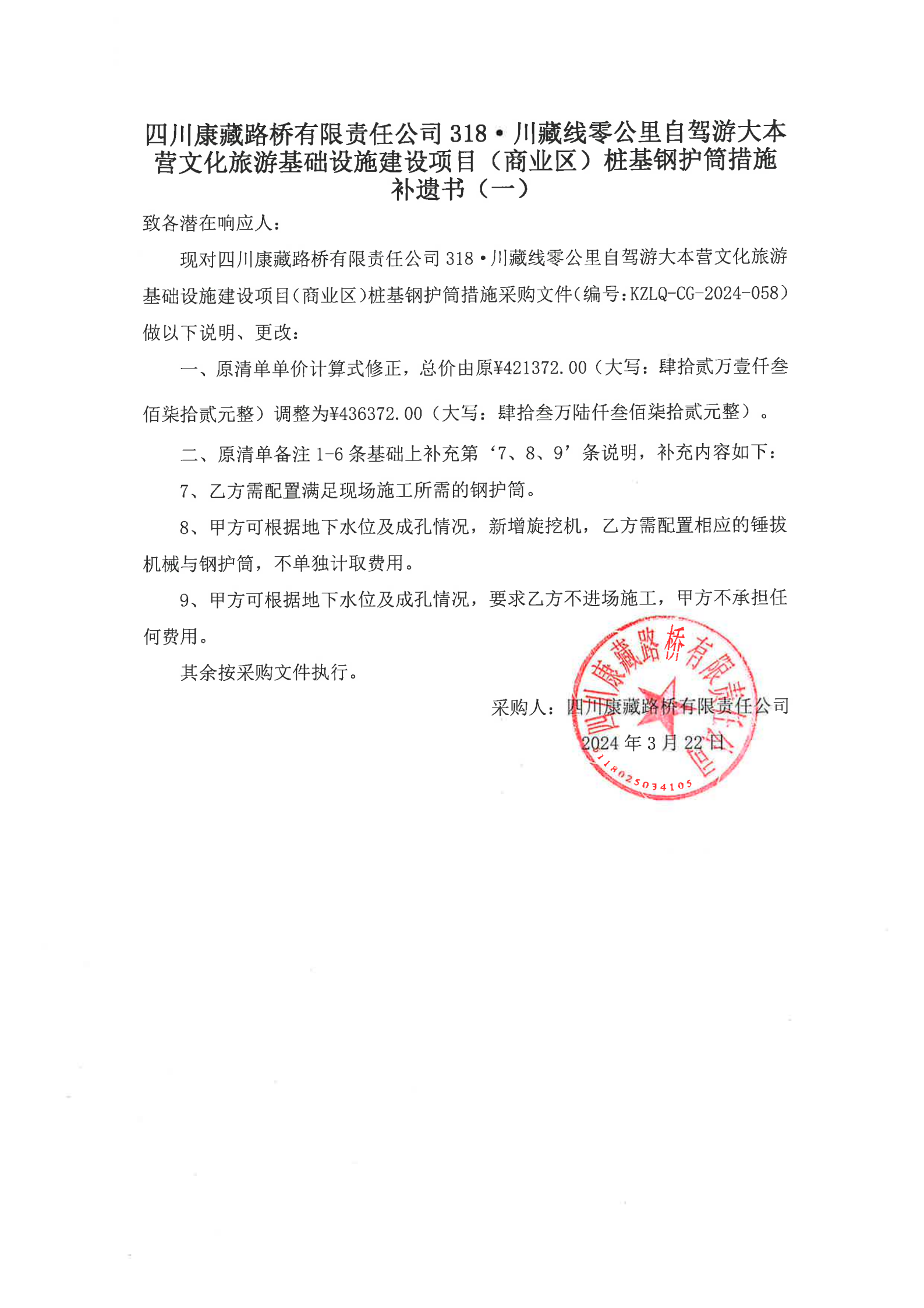四川康藏路橋有限責(zé)任公司318·川藏公路零公里自駕游大本營文化旅游基礎(chǔ)設(shè)施建設(shè)項目(商業(yè)區(qū))樁基鋼護筒措施補遺書(一)
