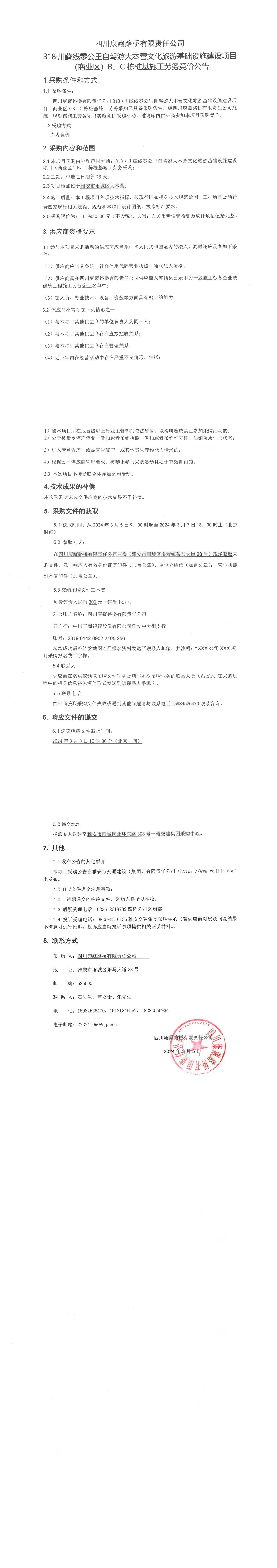 四川康藏路橋有限責任公司318·川藏公路零公里自駕游大本營文化旅游基礎設施建設項目(商業(yè)區(qū))B\C棟預制管樁采購競價公告