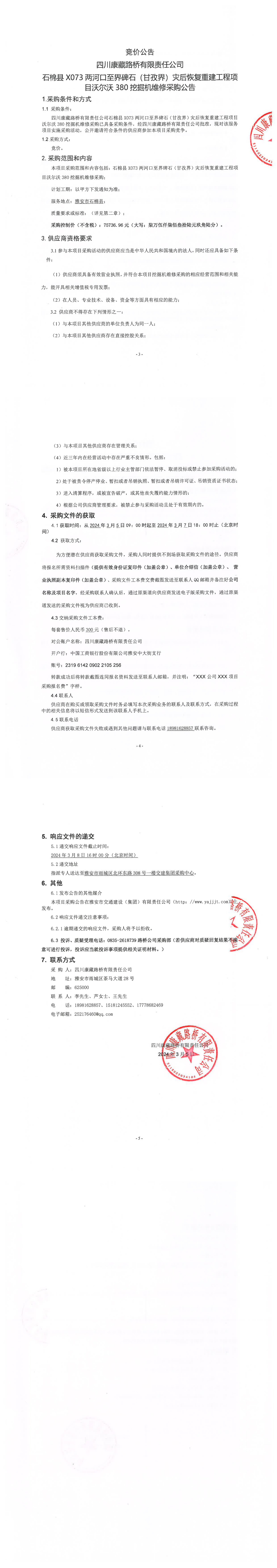 四川康藏路橋有限責任公司石棉縣X073兩河口至界碑石(甘孜界)災(zāi)后恢復(fù)重建工程項目沃爾沃380挖掘機維修采購公告