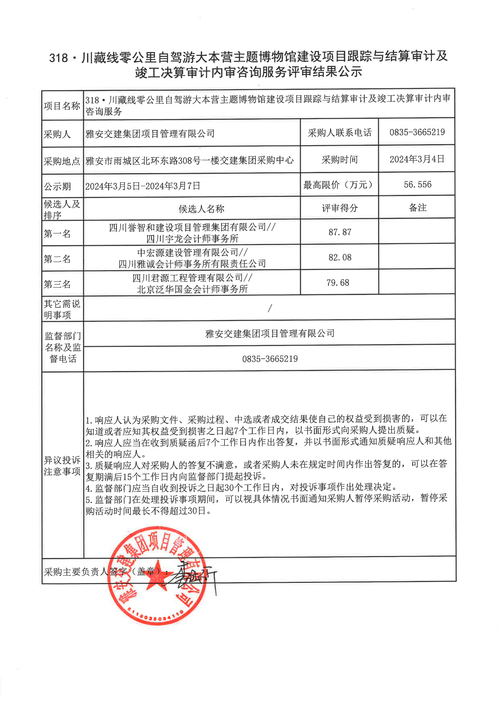 雅安交建集團(tuán)項目管理有限公司318·川藏線零公里自駕游大本營主題博物館建設(shè)項目跟蹤與結(jié)算審計及竣工決算審計內(nèi)審咨詢服務(wù)評審結(jié)果公示