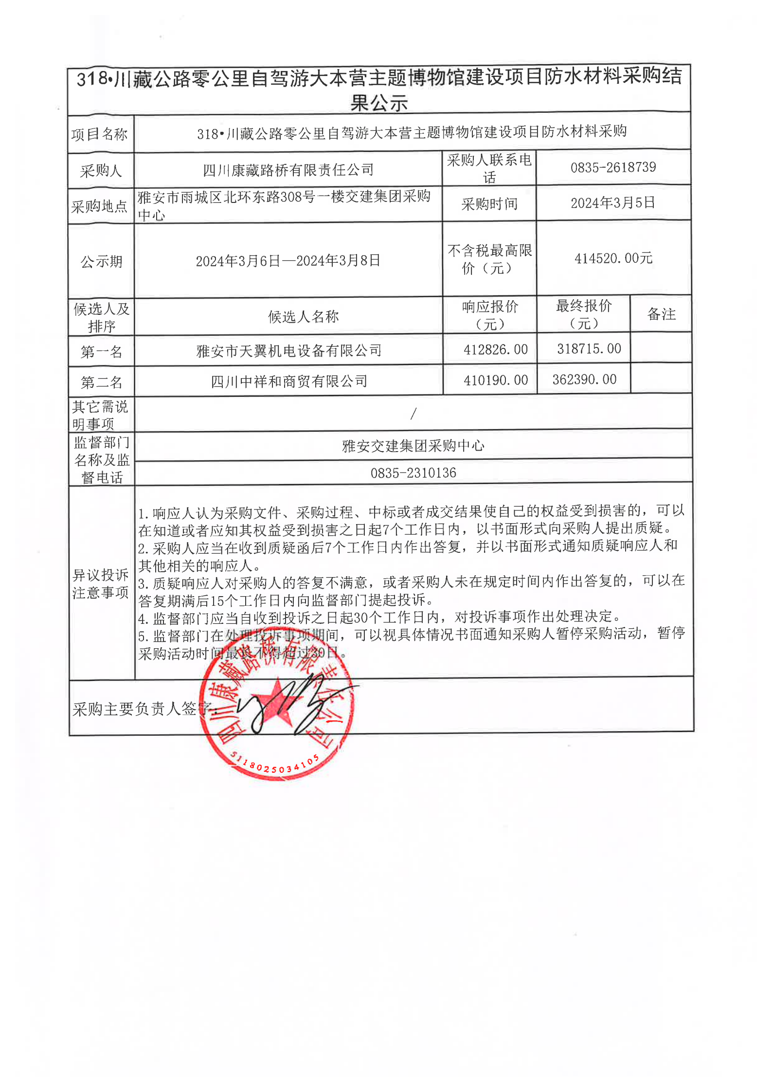 四川康藏路橋有限責(zé)任公司318·川藏公路零公里自駕游大本營(yíng)主題博物館建設(shè)項(xiàng)目防水材料采購結(jié)果公示