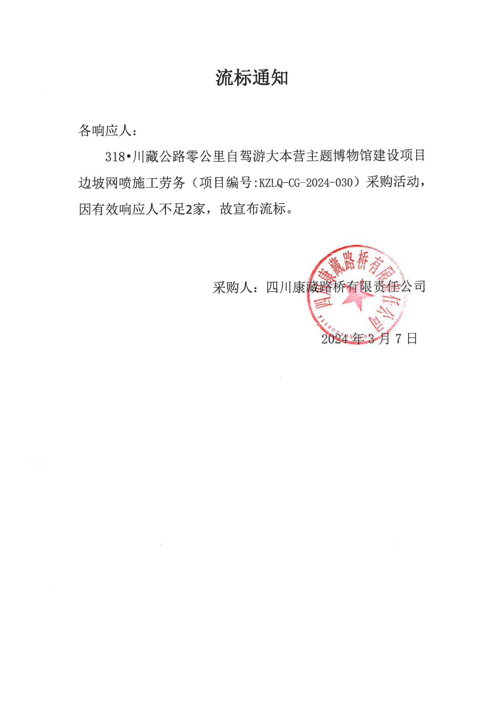 四川康藏路橋有限責任公司318·川藏公路零公里自駕游大本營主題博物館建設項目邊坡網噴施工勞務流標通知