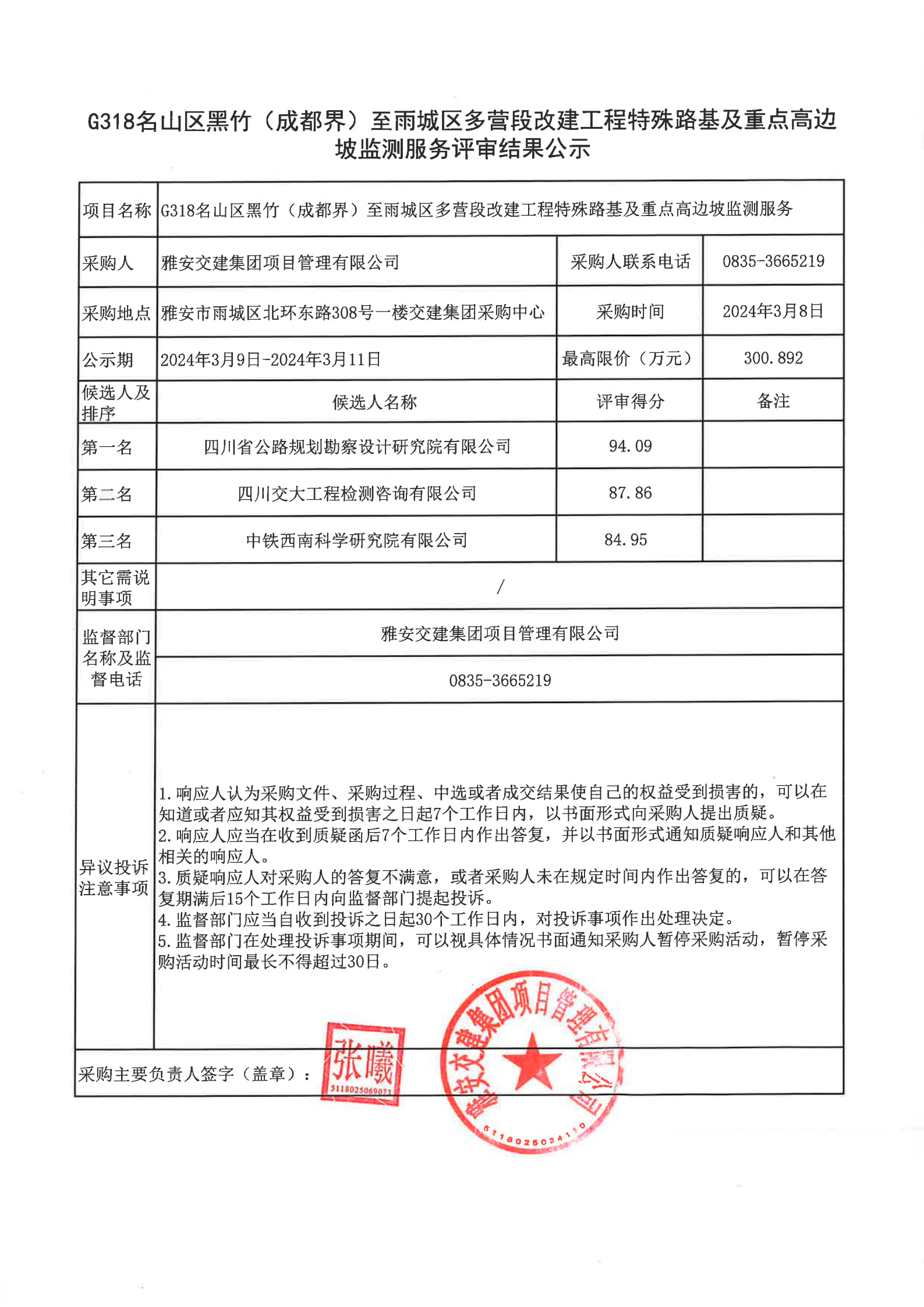 雅安交建集團(tuán)項(xiàng)目管理有限公司G318名山區(qū)黑竹(成度界)至雨城區(qū)多營段改建工程特殊路基及重點(diǎn)高邊坡監(jiān)測(cè)服務(wù)評(píng)審結(jié)果公示