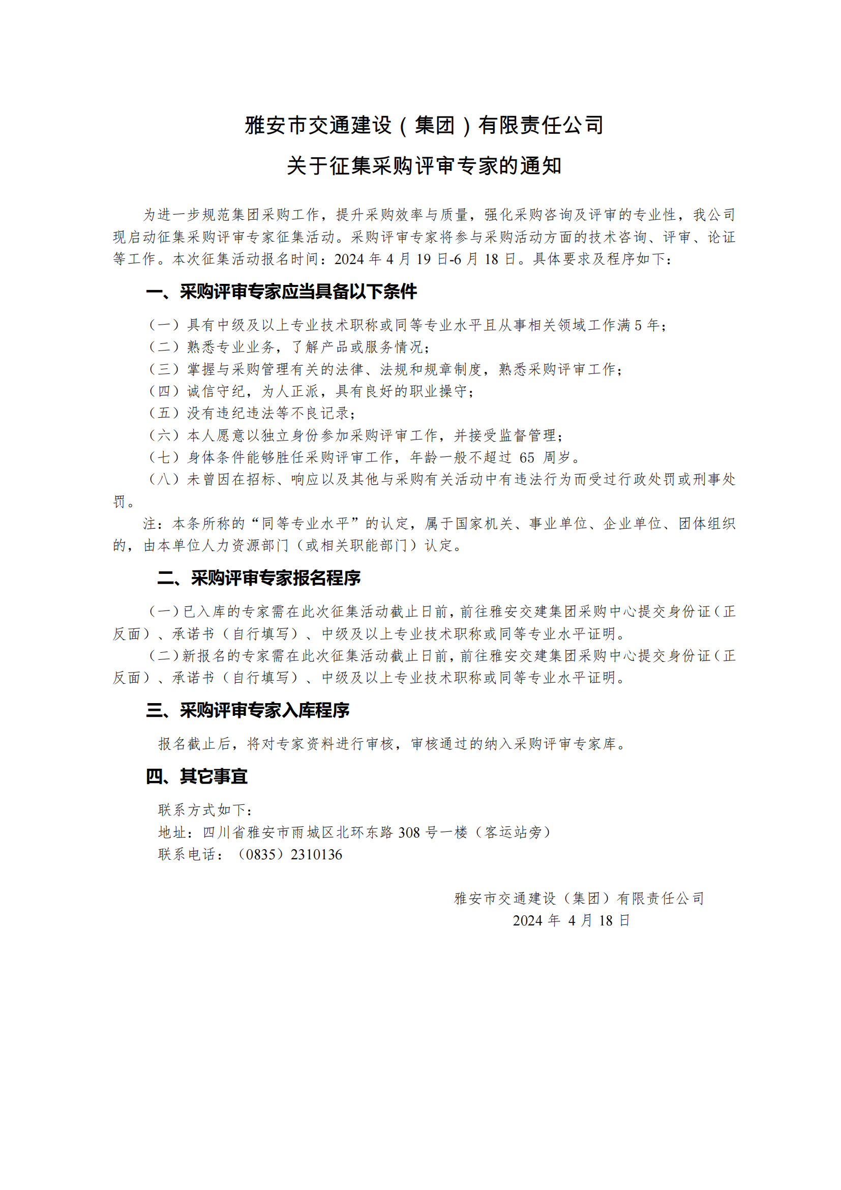 雅安市交通建設(shè)(集團(tuán))有限責(zé)任公司關(guān)于征集采購(gòu)評(píng)審專(zhuān)家的通知