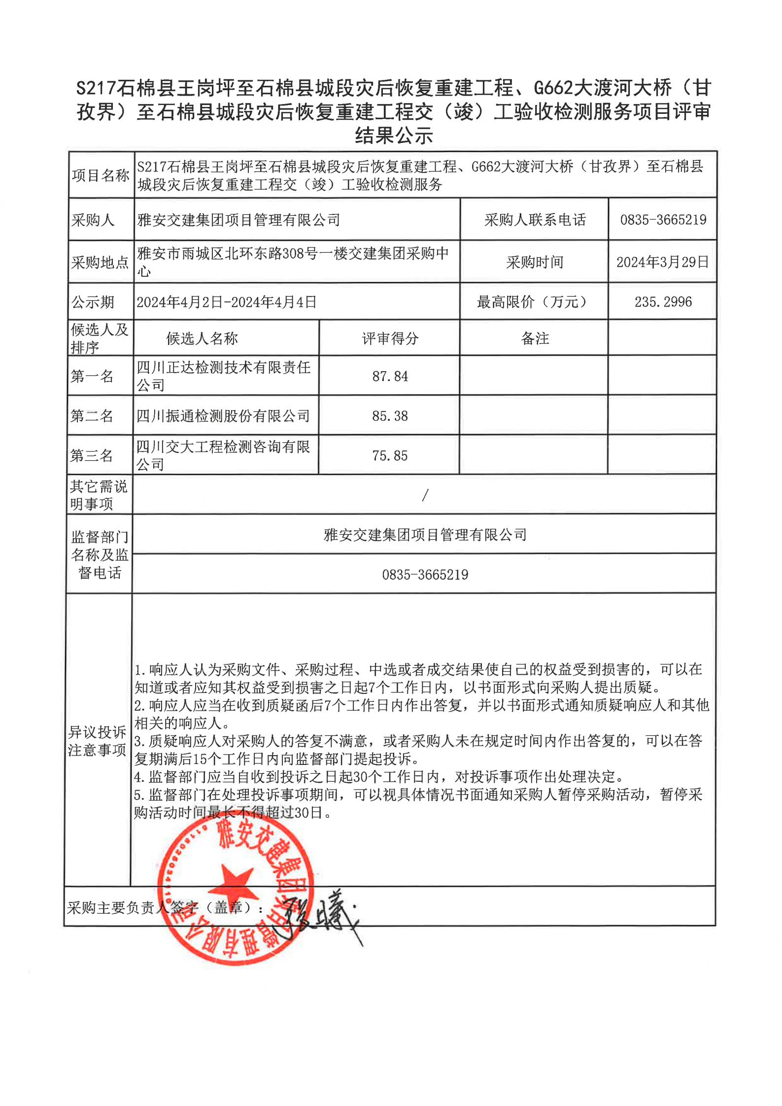 雅安交建集團(tuán)項(xiàng)目管理有限公司S217石棉縣王崗坪至石棉縣城段災(zāi)后恢復(fù)重建工程、G662大渡河大橋(甘孜界)至石棉縣城段災(zāi)后恢復(fù)重建工程交(竣)工驗(yàn)收檢測服務(wù)項(xiàng)目評審結(jié)果公示