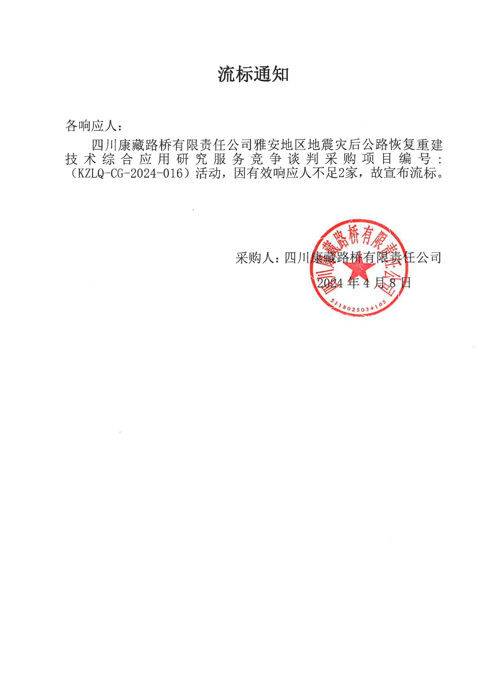 四川康藏路橋有限責(zé)任公司雅安地區(qū)地震災(zāi)后公路恢復(fù)重建技術(shù)綜合應(yīng)用研究服務(wù)流標(biāo)通知