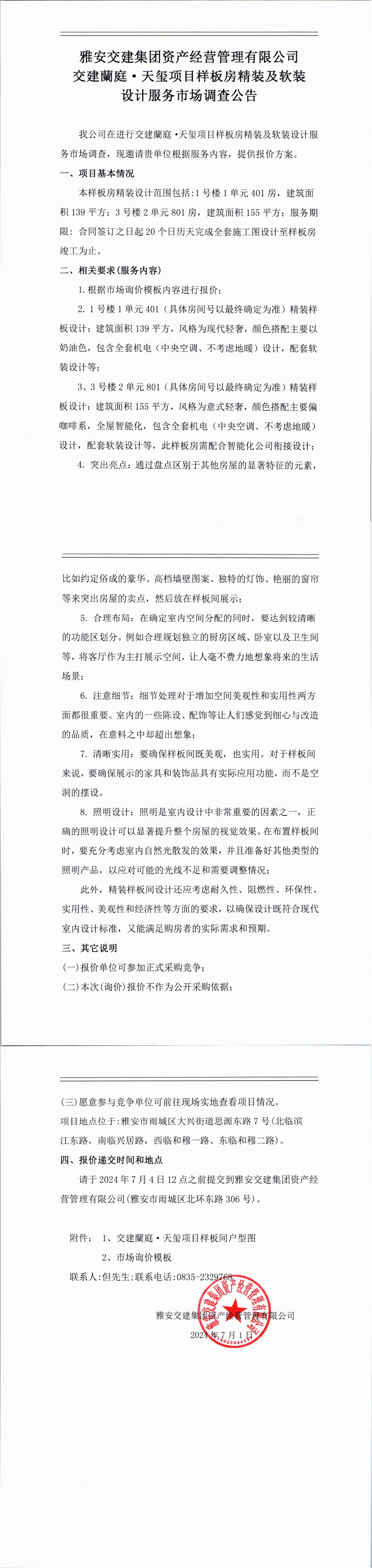 雅安交建集團(tuán)資產(chǎn)經(jīng)營(yíng)管理有限公司交建蘭庭·天璽項(xiàng)目樣板房精裝及軟裝設(shè)計(jì)服務(wù)市場(chǎng)調(diào)查公告
