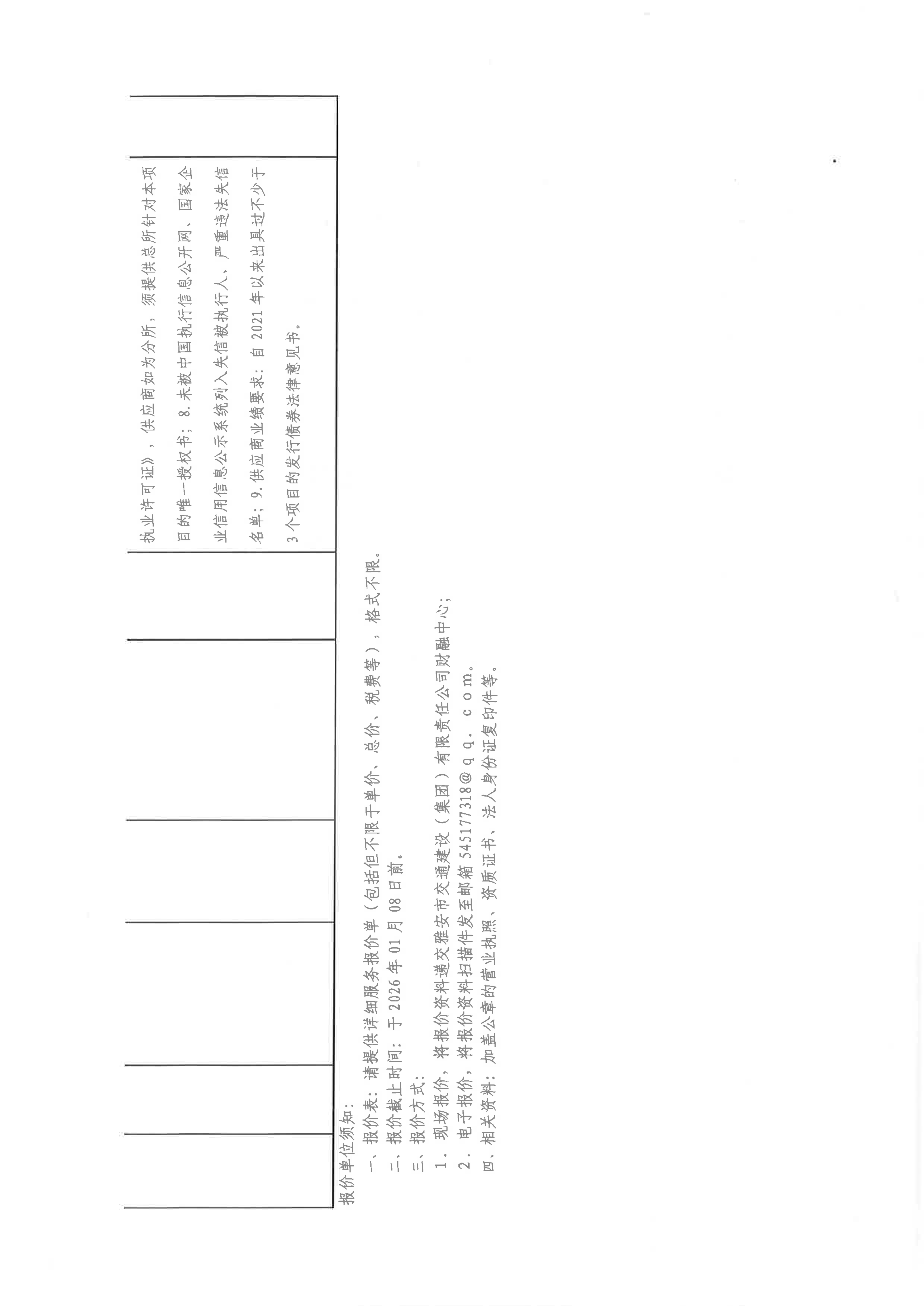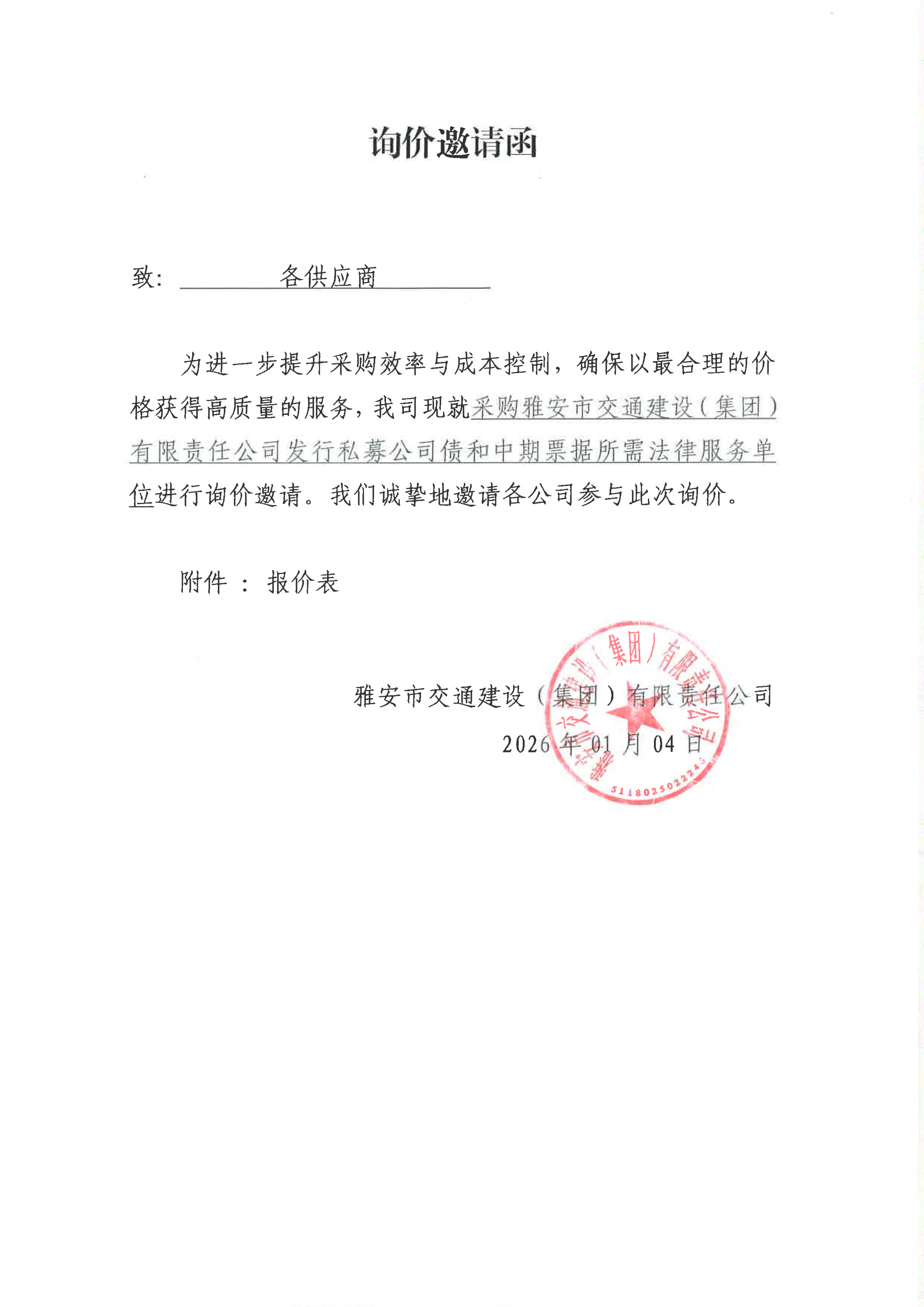 關(guān)于雅安市交通建設(shè)(集團(tuán))有限責(zé)任公司發(fā)行私募公司債和中期票據(jù)所需法律服務(wù)采購(gòu)限價(jià)的詢價(jià)函
